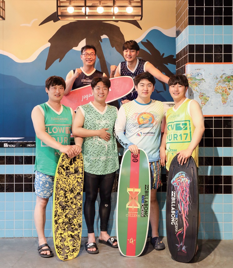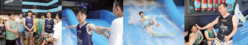 최근 날씨와 상관없이 시원하게 물살을 탈 수 있는 ‘실내 서핑’이 각광받고 있다. 실제 서핑처럼 자연을 만끽할 수는 없지만, 초보자들이 서핑의 짜릿함을 느끼기에 제격이라고. 충청EM팀 이상현 EM팀장, 고흥주 · 박경훈 · 이지용 · 정철목 · 채명호 EM이 실내 서핑장의 거친 물살에 도전장을 던졌다. 이번 체험은 충청EM팀 막내, 채명호 EM 덕분에 성사됐다. “충청EM팀 식구들의 단합을 위해 신청했습니다. 다들 업무로 바쁘신데도 제 제안에 선뜻 함께해주셔서 정말 감사하죠.” 채명호 EM의 들뜬 모습과 함께 여섯 명이 한자리에 모였다.