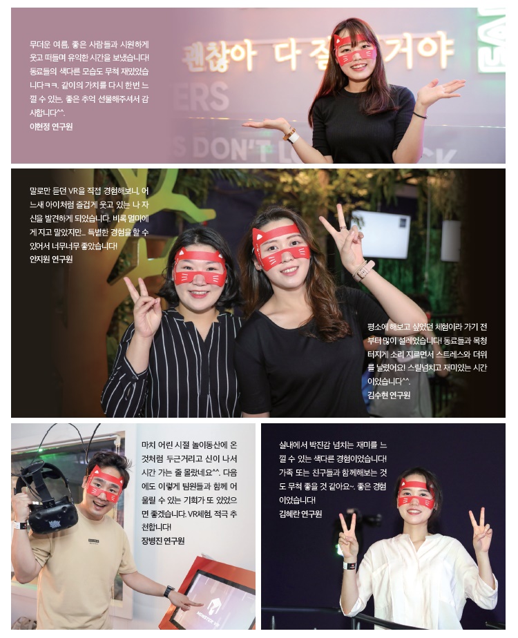 워밍업을 끝낸 다섯 명의 미디어개발팀 식구들은 본격적으로 VR체험관의 이곳저곳을 드나들기 시작했다. 거대한 거북선 위에 올라 활을 겨누고, 커다란 총을 든 채 좀비들과 전쟁을 치르며 가상 현실의 세계에 푹 빠진 듯했다. VR안경을 쓰고 집중한 나머지 입을 ‘헤~’ 벌린 채 허공을 휘젓는 서로의 모습에 웃기도 했다. 정작 방금 전까지 자신도 똑같은 모습이었는데 말이다.