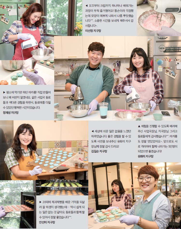 이들은 4시간 가까운 수업시간 탓인지 지친 기색이 역력함에도 가족, 동료들과 함께 나눠먹을 생각에 마지막까지 정성스레 포장을 마쳤다. 밝은 기운과 웃음으로 가득했던 부천사업국 식구들의 마카롱 도전기! 다섯 지구장의 정성이 마카롱을 타고 저마다의 소중한 누군가에게 기분 좋은 달콤함으로 선물되었기를 기대해본다.