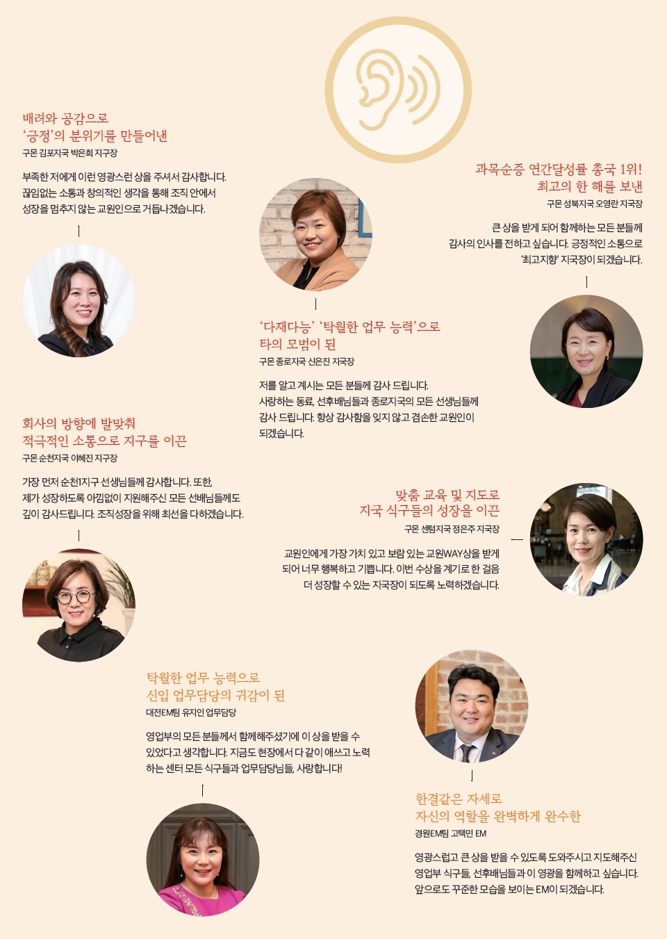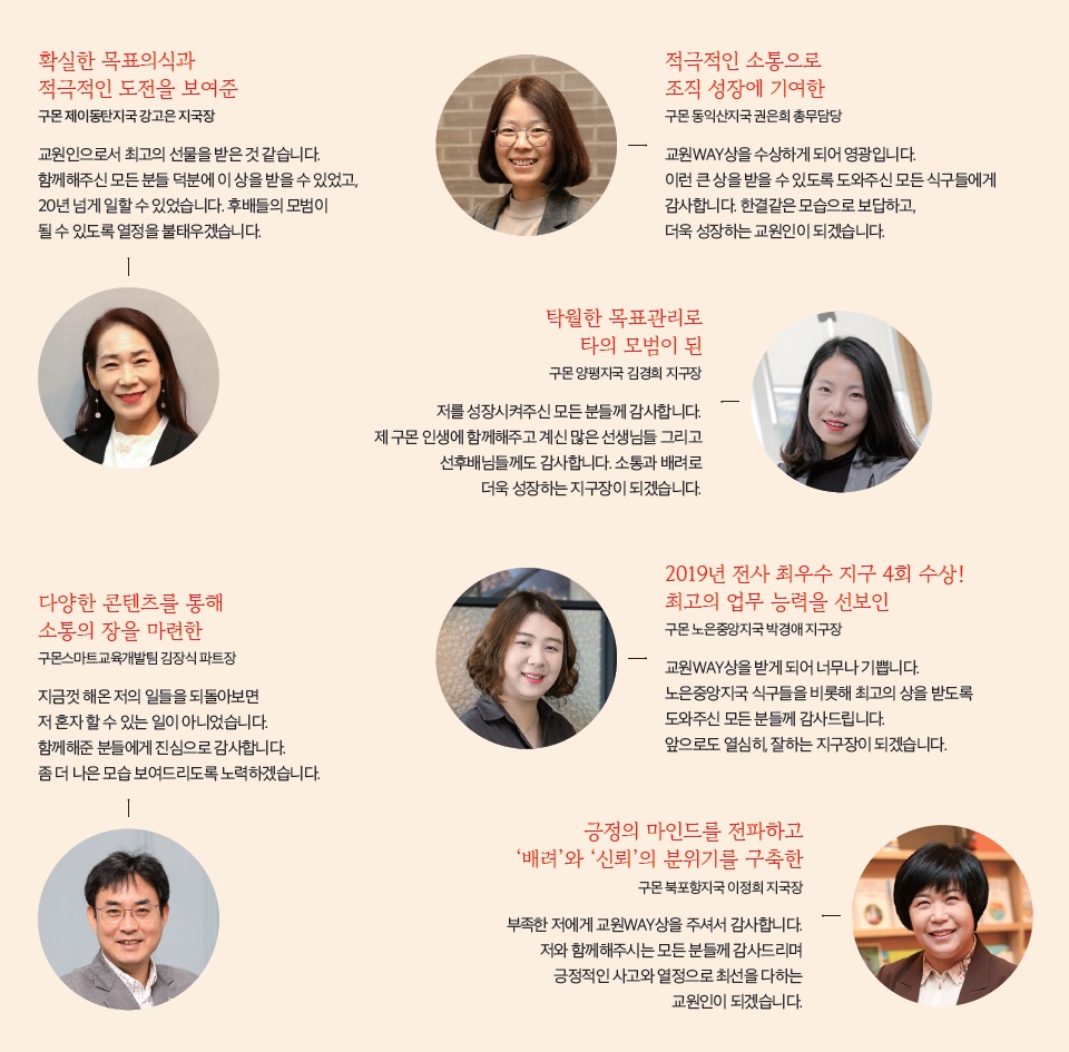 한 해 동안 교원그룹의 핵심가치를 몸소 실천한 교원 가족들에게 수여되는 ‘교원WAY상’. 올해도 38명의 교원 가족들이 수상의 영광을 누렸다. 2019년, 교원의 길을 걸어온 수상자들의 모습을 함께 만나보자.