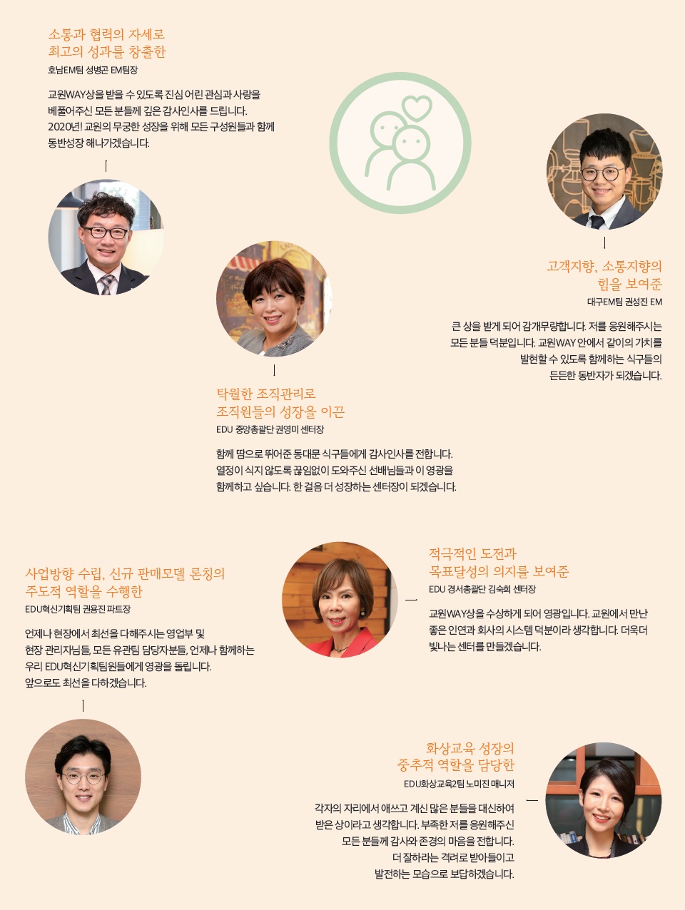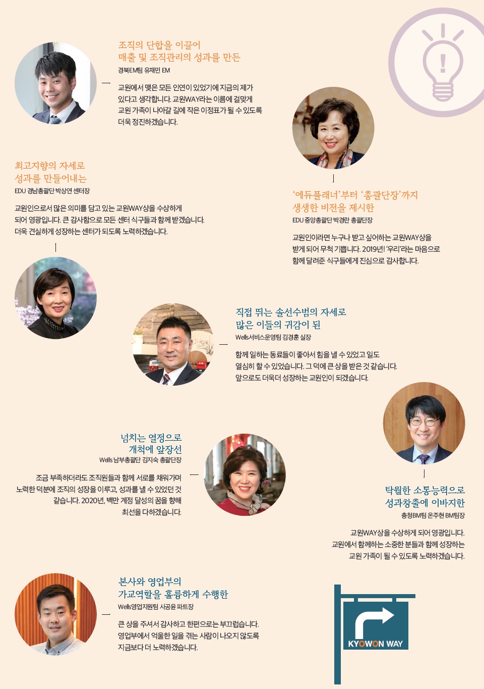 한 해 동안 교원그룹의 핵심가치를 몸소 실천한 교원 가족들에게 수여되는 ‘교원WAY상’. 올해도 38명의 교원 가족들이 수상의 영광을 누렸다. 2019년, 교원의 길을 걸어온 수상자들의 모습을 함께 만나보자.