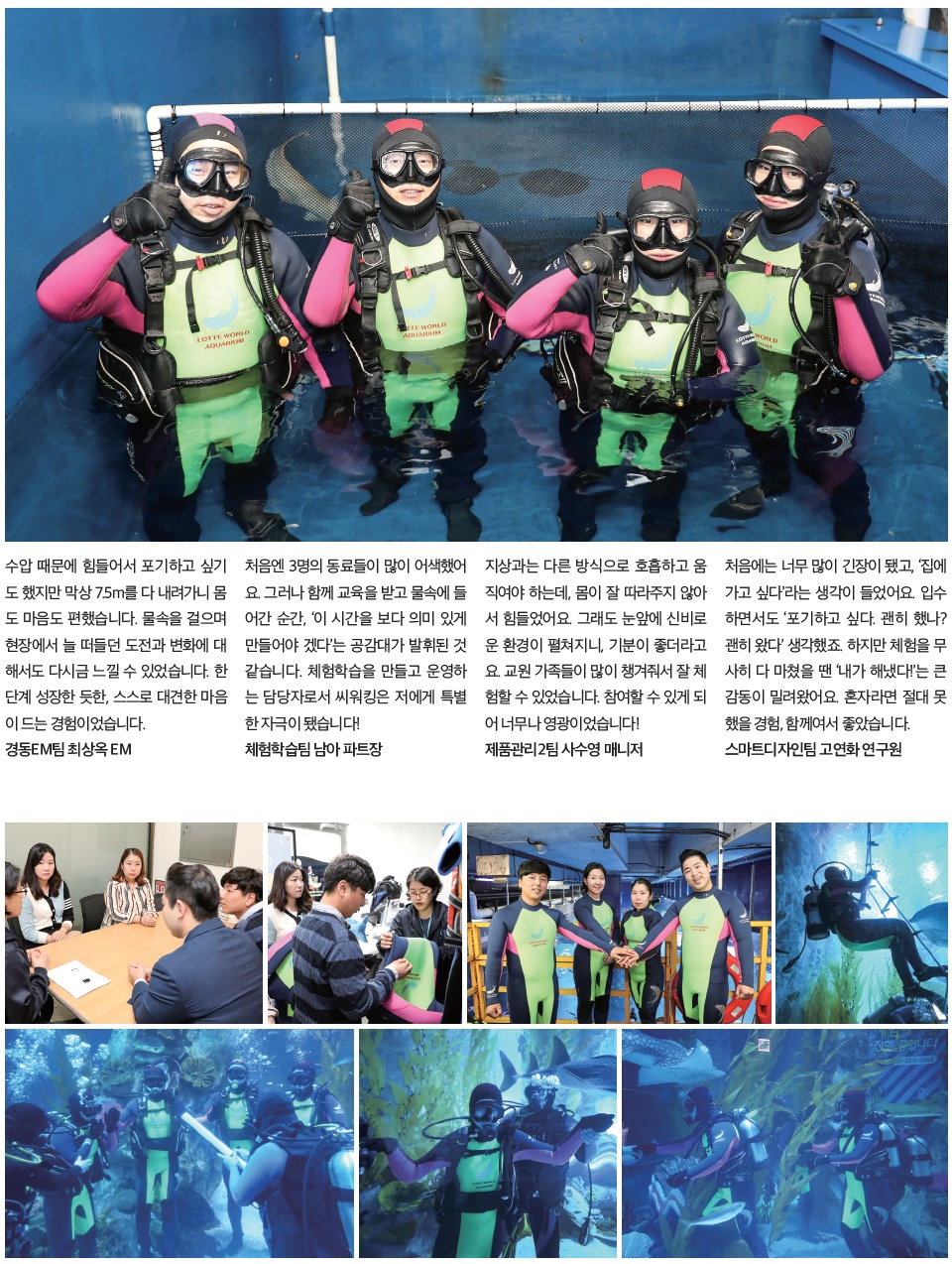 씨워킹은 말 그대로 바닷속을 걷는 해양 액티비티다. 다양한 해양생물을 바로 눈앞에서 만나볼 수 있어 무엇보다 신비하고 색다른 경험을 할 수 있다. 이를 위해 잠실 롯데월드몰 아쿠아리움으로 향했다. 특별히 교원그룹 창립 34주년을 몸소 축하하기 위해 33·34세 교원 가족 네 명이 함께했다. 체험학습팀 남아 파트장, 제품관리2팀 사수영 매니저, 경동EM팀 최상옥 EM, 스마트디자인팀 고연화 연구원이다.
