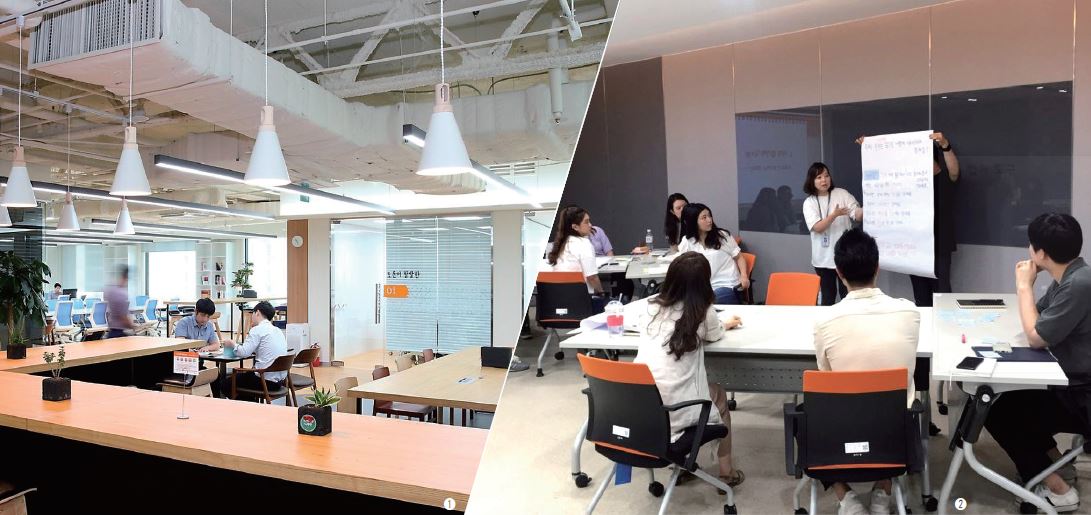 ➊ 씨 랩C.LAB : 교원그룹의 업무혁신 공간인 씨 랩은, 연결Connect, 협업Collaborate, 창조Create를 이끌어 내기 위해 지난 2018년 마련됐다. 씨 랩 중앙에는 바Bar 형태의 긴 테이블이 비치된 ‘생각나눔터’가 있다. 교원그룹 구성원들은 이 테이블에 앉거나 서서 자유롭게 소통할 수 있다. 씨 랩 내에는 ▲강연과 공연, 좌담회 등 행사를 개최하고 즐길 수 있도록 프로젝터와 계단식 좌석이 설치된 ‘씨 살롱C.SALON’ ▲1인용 집중업무공간이자 폰 부스인 ‘생각 캡슐’ ▲파티션과 경계를 없앤 협업 공간인 ‘스마트 오피스’가 마련돼 있다. ‘스마트 오피스’에서는 직원들이 원하는 자리에 앉아 각자의 업무를 볼 수 있기 때문에 평소에 다른 층에서 근무하거나 업무 연결성이 적어 협업 기회가 없던 타 부서원들이 만나 함께 소통할 수 있다. 뿐만 아니라 투명한 유리벽이 설치된 4~6인 규모 회의 공간도 여러 개 마련하고 회의 공간의 한 쪽 벽면은 화이트보드로 만들어 구성원들이 의견을 나누고 메모할 수 있도록 했다. 더불어 씨 랩 내에 프로젝트 TF팀을 위해 별도로 공간을 마련해 프로젝트 TF팀들이 집중해 업무를 수행하도록 도왔다.