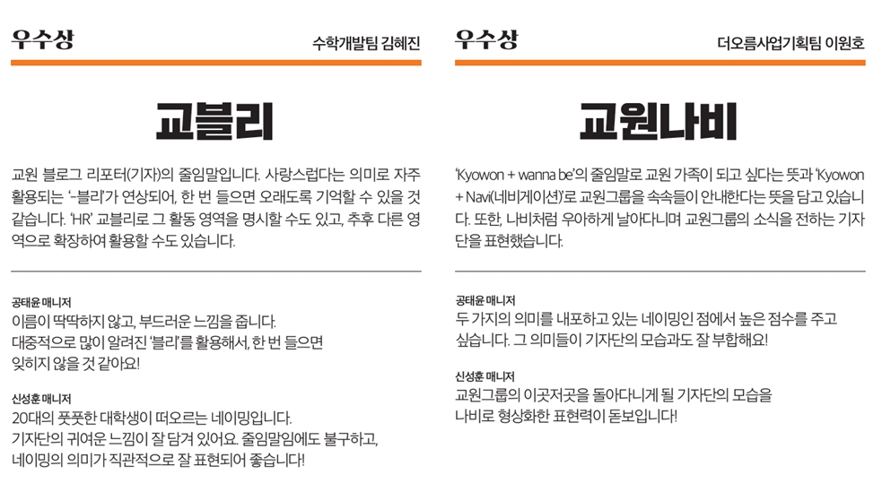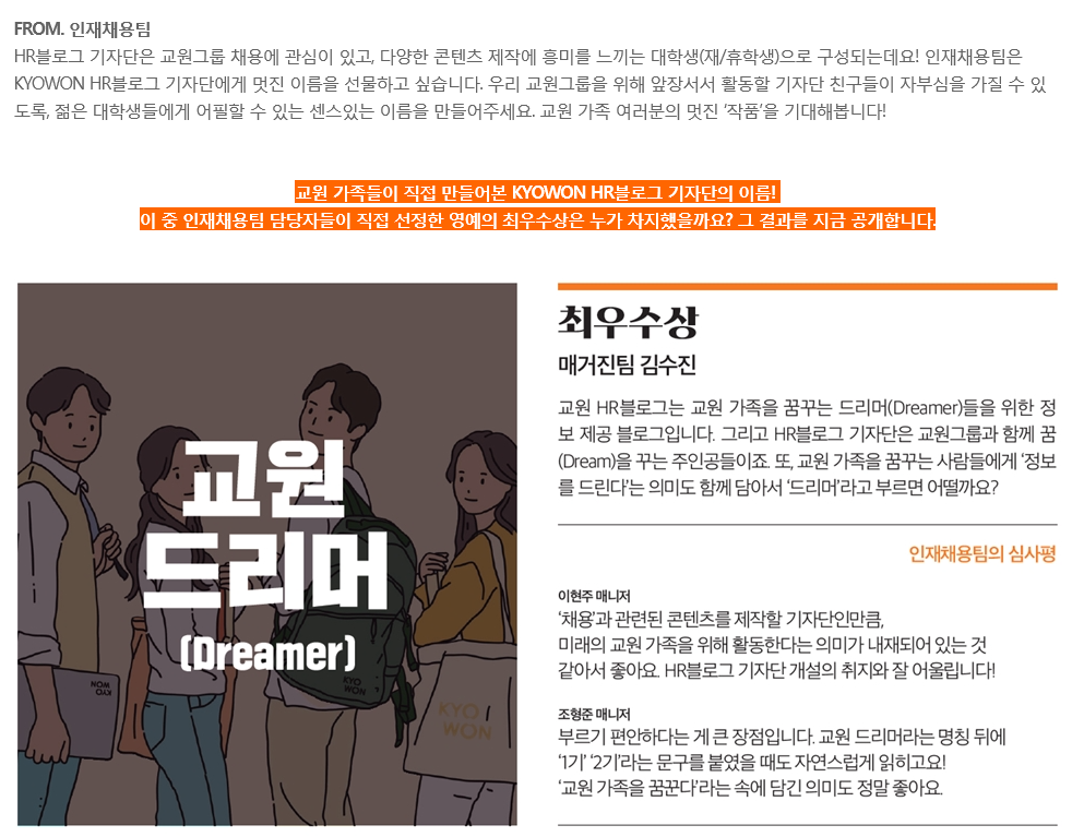 교원그룹이 ‘제1기 KYOWON HR블로그 기자단’을 모집합니다. 선발된 기자단원들은 ‘교원그룹의 채용’을 주제로 다양한 콘텐츠를 제작해 HR블로그에 업로드 하는 역할을 담당하게 되는데요. 교원그룹을 대표해서 우리의 강점 알리기에 앞장설 기자단원들! 교원 가족들이 이들을 위해 ‘HR블로그 기자단’의 이름을 직접 만들었습니다. HR블로그 기자단의 활동에 날개를 달아줄, 그 이름을 지금 공개합니다!