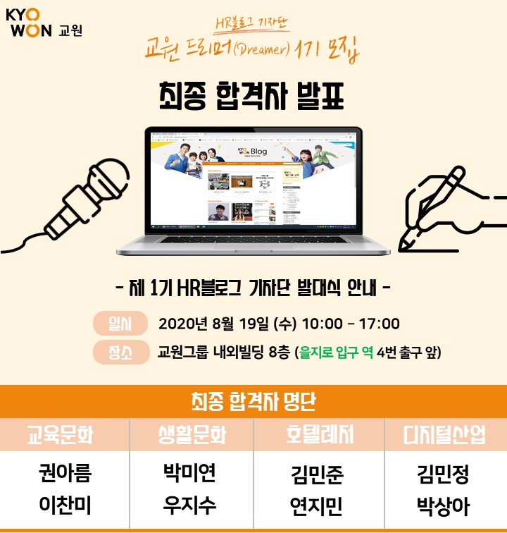 | [모집안내] HR블로그 기자단(Kyowon Dreamer 1기) 서류심사 결과 (1) | 2020.07.23 |