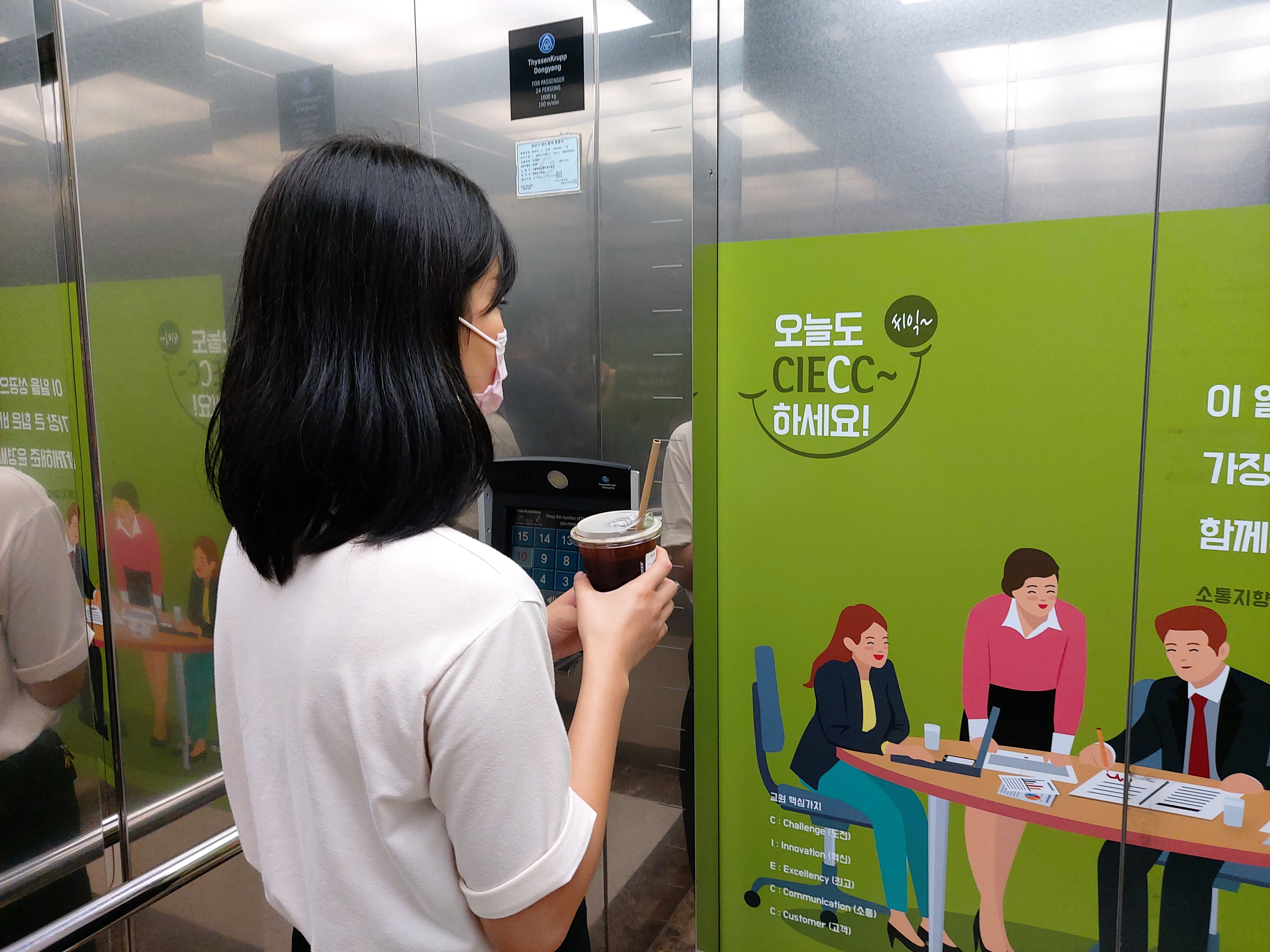 엘리베이터 안에 있는 교원의 인재 철학인 CIECC 포스터를 보며