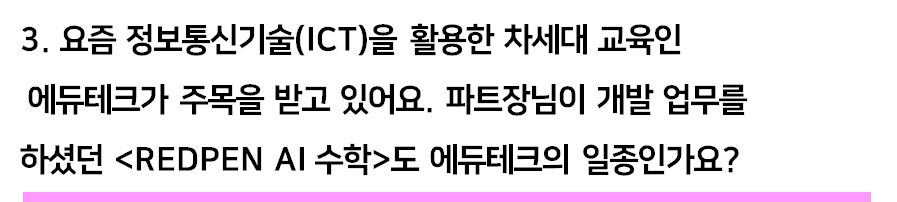 안녕하세요! 교육문화부문을 맡은 교원 드리머 1기 권아름입니다. 기술 발전에 따라 교육 콘텐츠도 변화해가고 있는데요. 정보통신기술(ICT)을 활용한 차세대 교육인 에듀테크가 주목받고 있습니다. 이번에는 교육 콘텐츠의 변화 중심에 있는 에듀테크 직무자 분과 인터뷰하고 왔습니다. AI와 수학을 접목한 교육 콘텐츠인 <REDPEN AI 수학> 기획, 개발 업무를 담당하고 계신 한주연 파트장님을 만나볼까요?