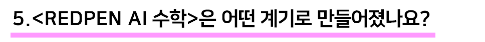 마지막으로 초등학생이 굉장히 바쁘다 보니까 짧은 시간 안에 필요한 것만 학습하면 좋겠다고 생각했어요. 그러기 위해서는 그룹 수업보다는 1대 1 과외가 효과적인데 모든 학생이 과외를 받을 수 있는 것은 아니잖아요. 좋은 과외 선생님 구하기 어렵기도 하고, 과외비가 비싸기도 하니까요. 그런 점을 채워주기 위해 5G나 인공지능 기술을 이용해 AI 선생님을 붙여 주면 되겠다는 생각으로 <REDPEN AI 수학>이 만들어졌습니다.