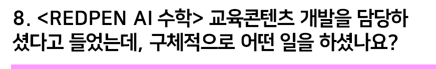 교육 콘텐츠로는 <REDPEN AI 수학>에 들어가는 학습 영상, 디지털 문제, 인터랙티브 콘텐츠 등 다양한 수학 콘텐츠 개발을 하였어요.