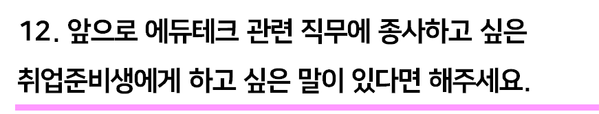 옛날에는 교육 관련 콘텐츠를 만든다고 하면 딱딱하고, 지루한 일을 한다고 생각했어요. 그러나 에듀테크는 신기하고 재미있는 부분이 많아요. 기술과 교육이 접목돼서 제 눈에 구현되는 것을 보는 것만으로 굉장히 재밌거든요. 단순히 딱딱하고 지루하고 교육 상품이라는 생각보다는 너무나 신기하고 재미있는 것들이 내가 원하는 대로 구현이 되는 직무라고 생각하면 좋을 것 같아요. 에듀테크가 성장하는 단계라 인력이 많이 필요하고 시장 전망도 좋아요. 많이 관심 가지고 채용 공고 나면 지원해 주셨으면 좋겠어요. 특히 아이디어나 기획력이 넘치는 분에게 추천합니다.