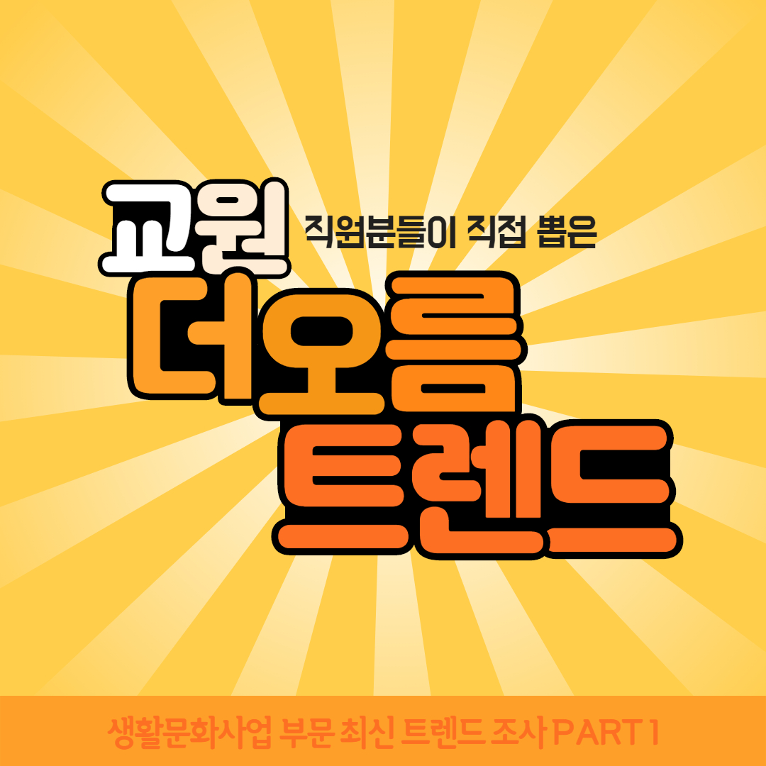 안녕하십니까. 교원 HR 블로그 기자단 드리머 1기 생활사업부문에 소속되어 있는 박미연, 우지수입니다. 취준으로 시험 준비하랴, 경험 쌓으랴 바쁘신 예비 교원인 분들을 위해서 저희가 대신 ‘조사’해보았습니다. 저희 기자단이 속한 생활문화사업 부문의 더오름과 Wells의 트렌드를 준비했는데요. 멘토님들과 상의하여 각 사업의 트렌드 후보 3개를 선정한 뒤, 일주일동안 직원분들의 투표를 받았습니다! 트렌드를 소개할 첫 번째 계열사는 바로 교원 더오름입니다! 과연 어떤 후보들이 BEST로 뽑혔을 지 교원 가족들의 의견과 함께 알아보도록 하겠습니다!