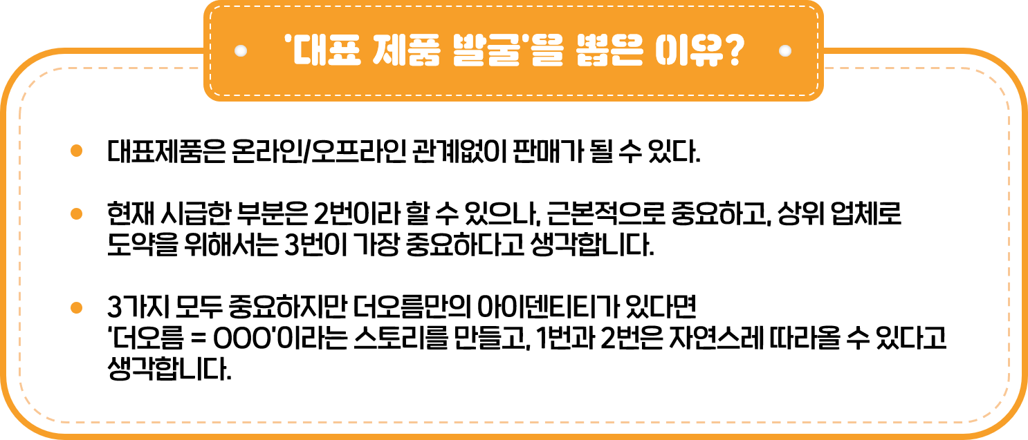 각각 2표, 13표, 14표로 언택트 사업 전개 방식과 대표 제품 발굴이 치열한 접전을 펼친 끝에 대표 제품 발굴이 BEST 1로 뽑히게 되었는데요. 왜 이러한 선택을 하게 되었는지 ‘대표 제품 발굴’에 대한 더오름 직원분들의 이야기를 들어보겠습니다!
