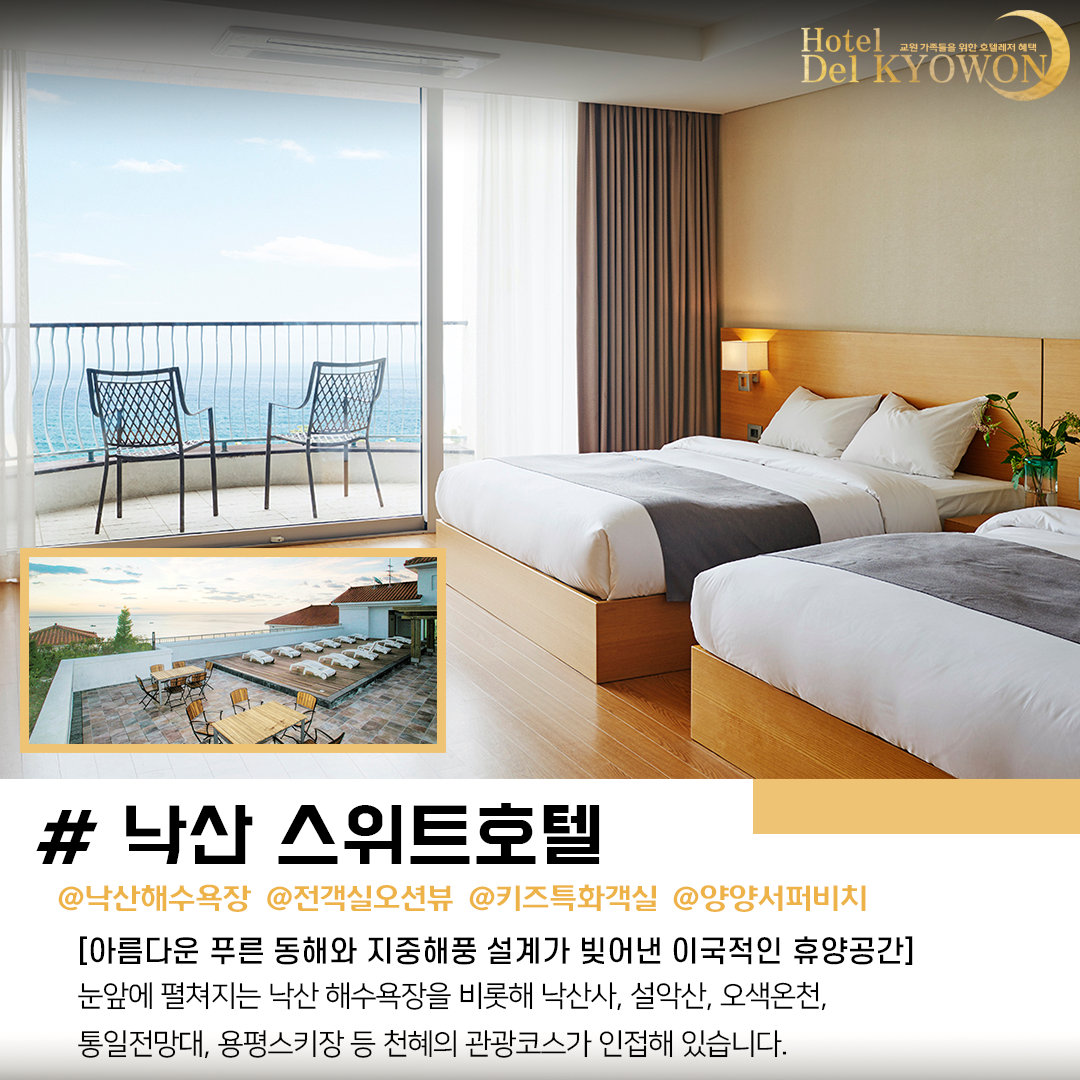 스위트 호텔 낙산은 강원도 양양의 낙산해수욕장과 인접해 있고 전 객실이 오션뷰라는 특징을 가지고 있습니다. 키즈 특화 객실을 보유하고 있어 아이를 동반한 가족에게 큰 환영을 받고 있습니다.