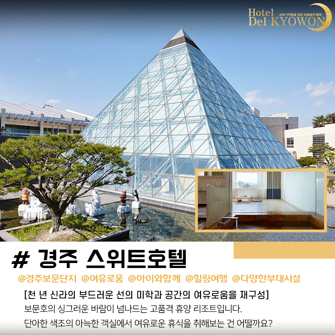 스위트 호텔 경주는 보문호의 싱그러운 바람이 넘나드는 경주 보문단지 내에 있으며 천 년 신라의 부드러운 선의 미학과 공간의 여유로움을 현대적인 라이프 스타일로 재구성한 고품격 휴양리조트입니다.