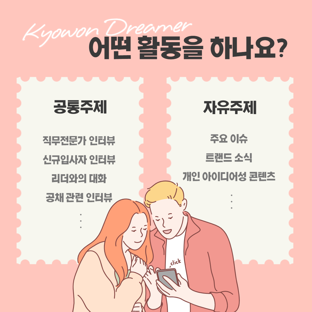 우선 교원드리머는 크게 직무인터뷰와 자유 콘텐츠 기사를 작성합니다!