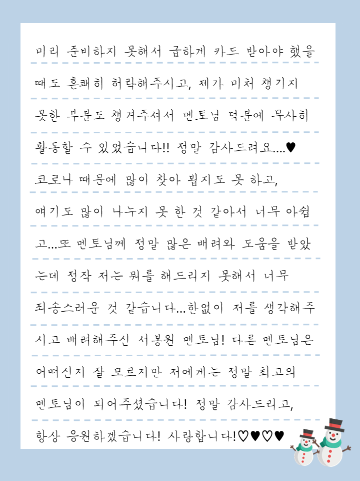 | 이서경 멘토님께 드리는 감사의 편지♡ (0) | 2020.12.22 |