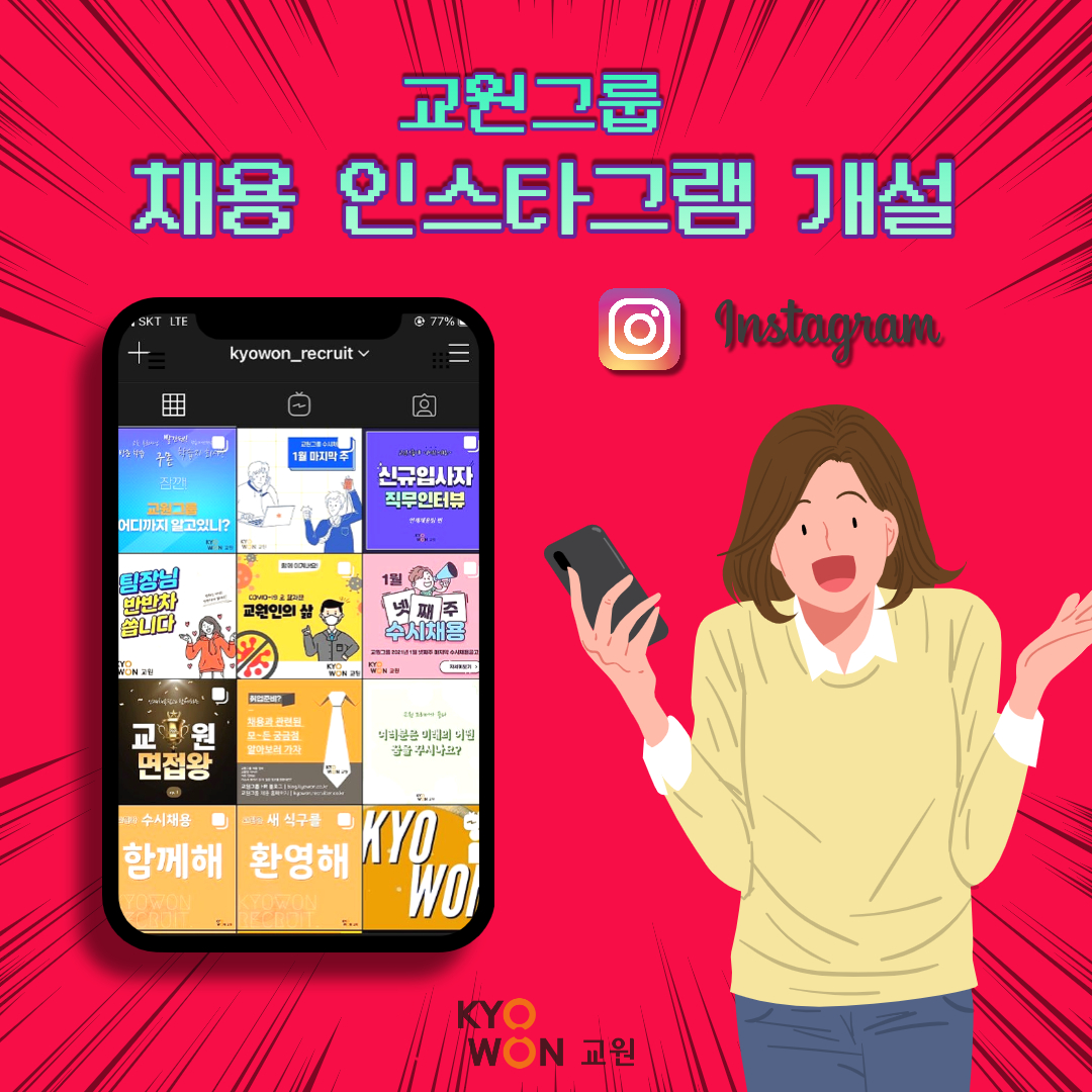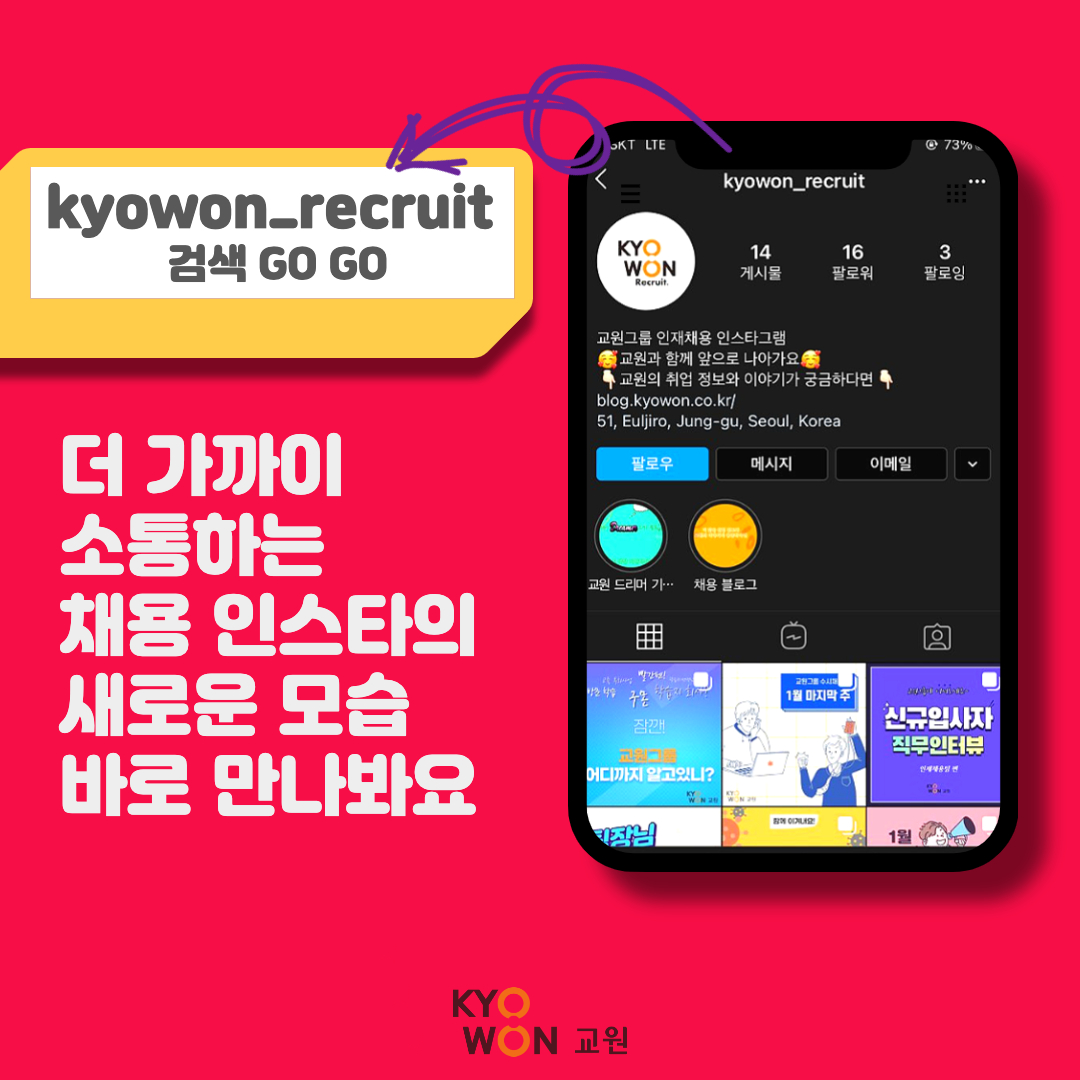 여러분들과 한걸음 더 나아가 소통하는 교원 인재채용 인스타그램의 새로운 모습을 [kyowon_recruit] 인스타 아이디 검색을 통해 바로 만나보세요~!