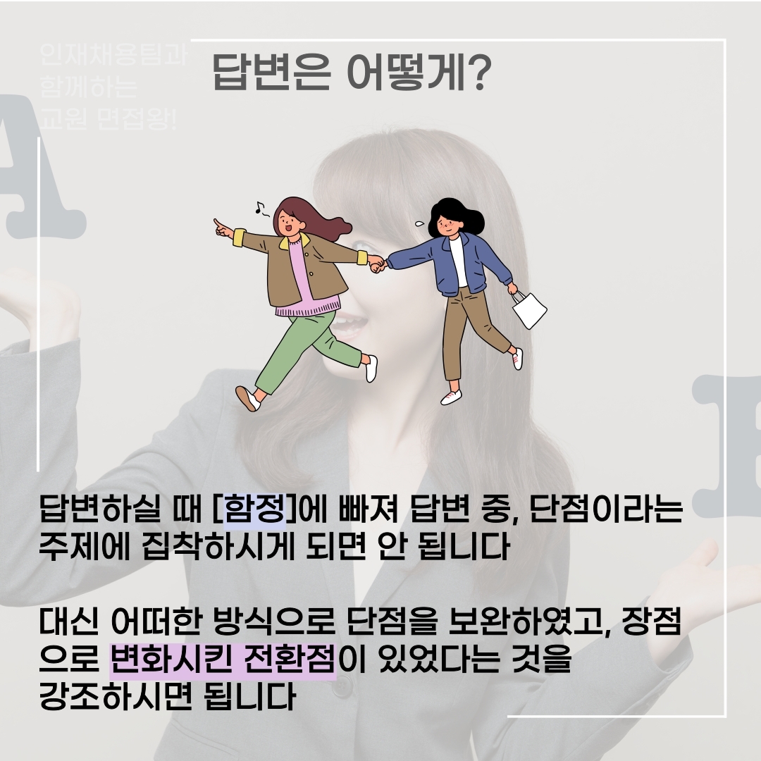 하지만 다시! 말씀드리지만 단점에 너무 집중하지 마세요. 전환점을 만들어내는 것이 답변의 포인트, 그리고 핵심입니다.