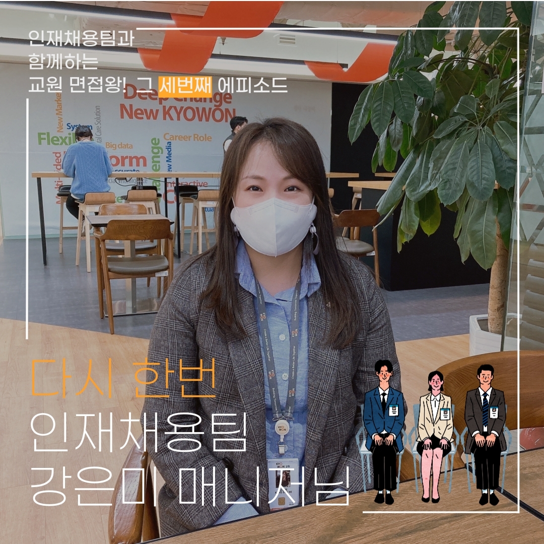 인재채용팀이 알려주는 교원그룹 면접왕 콘텐츠의 그 두 번째 에피소드 또한 무사히 마쳤는데요, 도움을 주신 강은미 매니저님께 다시 한번 감사의 말씀을 전하며 다음 에피소드를 준비해 보겠습니다~ 다음 에피소드에서는 다른 매니저님께서 등장하실 예정입니다. 그러니 다음 편의 주인공을 위해 많은 사랑과 관심 부탁드립니다!