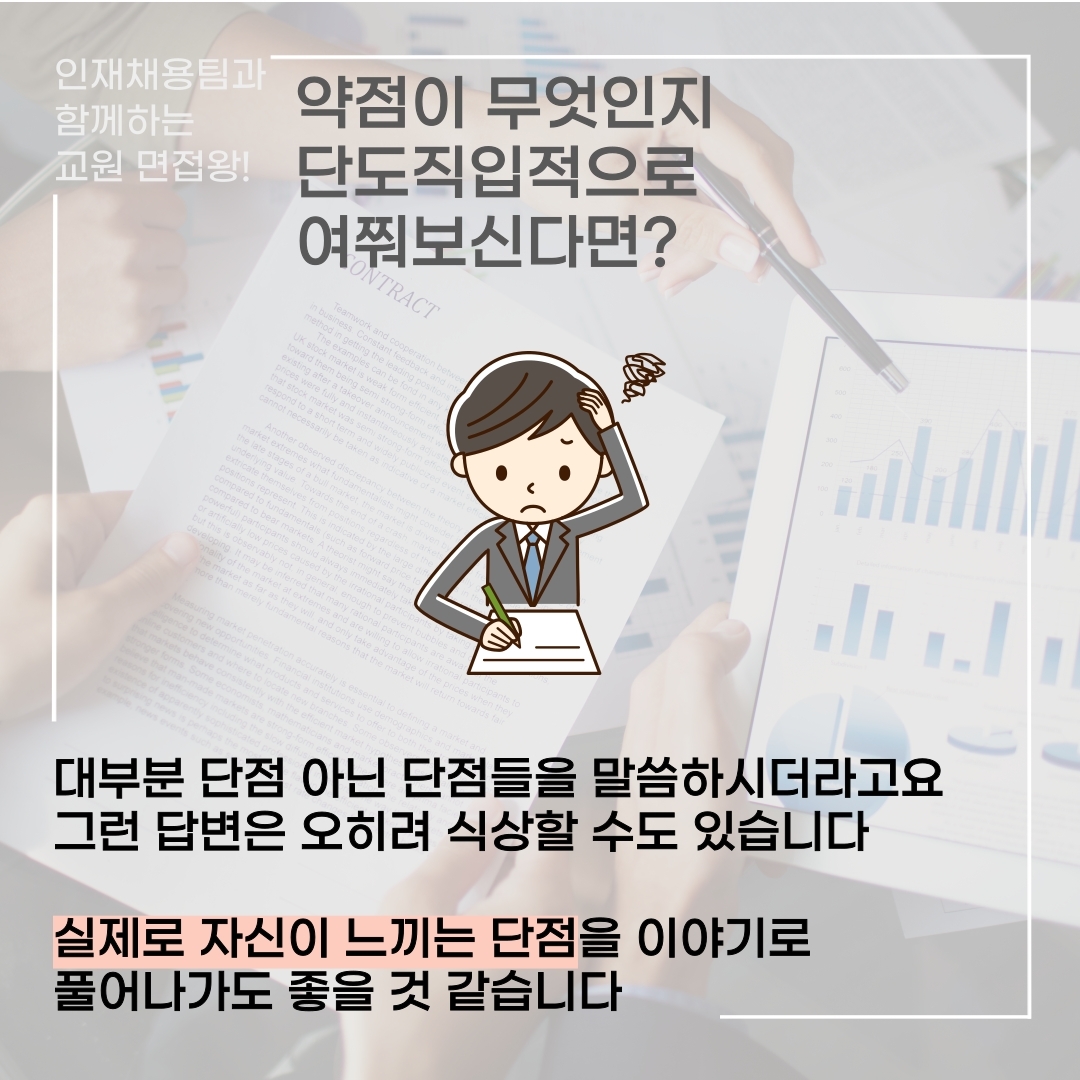 오늘은 면접 중 지원자를 당황하게 만드는 [약점]에 관한 질문들을 대처하는 방법을 알려드릴 겁니다. 평소 친구들에게 밝히기도 부끄러운 약점들을 면접관 분들 앞에서는 어떻게 설명드려야 할까...라는 고민을 가진 분들이 계실 탠데요. 위기를 오히려 기회로 바꾸는 팁. 지금 바로 알려드리겠습니다.