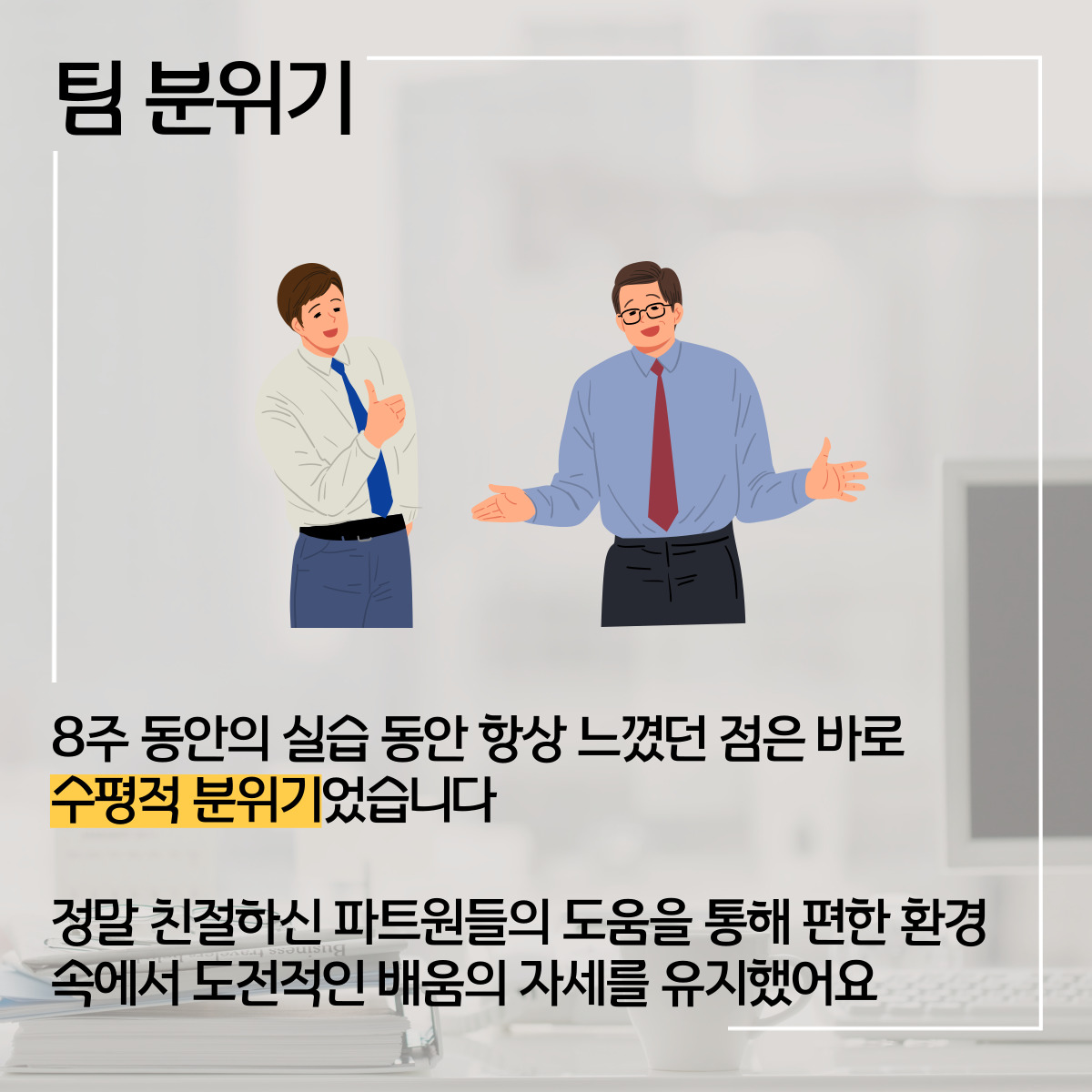 8주간 실습을 하면서 항상 느꼈던 것은 저희팀의 수평적 분위기입니다. 파트원 분들이 정말 친절하십니다. 사소한 부분이더라도 더 알려주시려고 저에게 신경을 써주셨고 제가 단기간 동안 최대한 많은 것을 배울 수 있도록 도움을 주셨습니다. 이러한 분위기가 편하게 다가와 실습기간 동안 생각 이상으로 많은 것을 도전적으로 배울 수 있었던 것 같습니다.