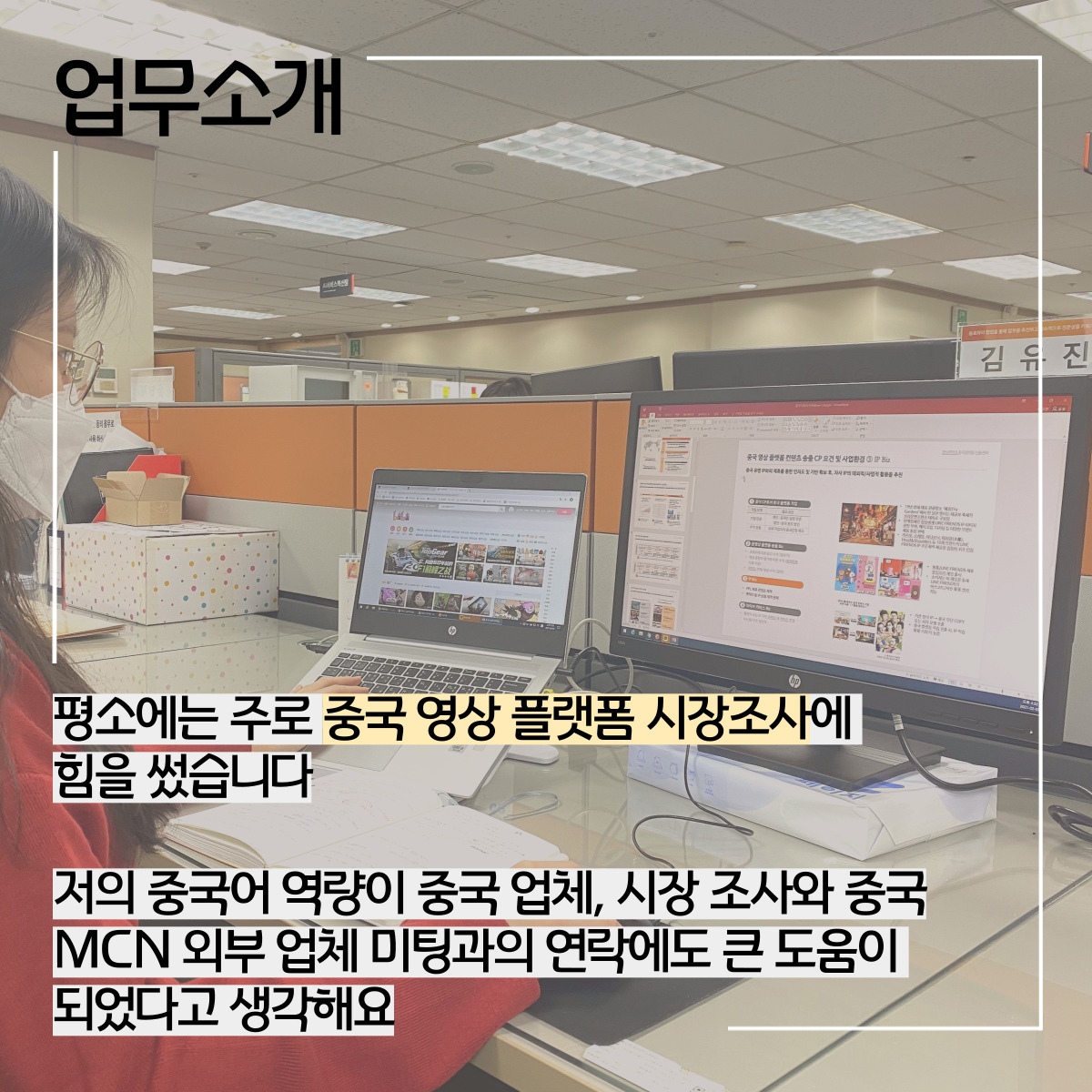저는 실습 동안 다양한 업무를 맡게 되었는데요, 주로 중국 영상 플랫폼 시장조사에 힘을 썼습니다. 아시다시피 중국에서는 글로벌 영상 플랫폼의 다양성에 있어 매우 제한적인 곳이라 교원그룹에서 유튜브를 통하여 중국 시장에는 자유롭게 콘텐츠를 업로드하지 못하고 있습니다. 제가 비교적 언어적 장벽이 낮은 인원이기에 중국 플랫폼 시장을 조사하는 일을 맡아서 업무를 하였습니다. 중국 영상 플랫폼 시장을 조사하고 거기에 맞는 중국의 MCN 업체와 외부 미팅 또한 진행하는데 도움을 드리고 있습니다. 또한 중국 업체와의 지속적인 계약 관계를 위해서 연락을 주고받는 역할도 하고 있습니다.