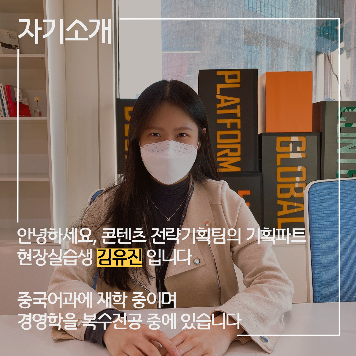 안녕하세요 저는 중국어과를 전공하고 경영학과 복수전공 중에 있는 김유진 학생입니다. 이번 실습기간 동안 교원 그룹 미래콘텐츠 연구실, 콘텐츠 전략기획팀의 기획파트에서 8주라는 시간을 보냈습니다.