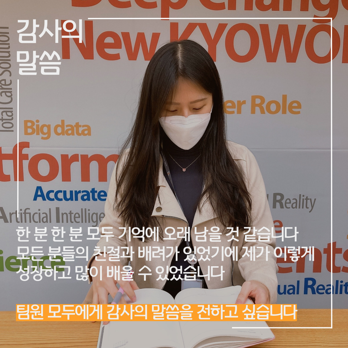 교원그룹 콘텐츠전략기획팀에서 8주간 실습을 진행하며 배운 점이 참 많았다고 얘기를 나누신 김유진 실습생 분께도 감사의 말씀을 드립니다! 웃음이 참 많다고 느낀 김유진 매니저님, 앞으로 멋진 일만 가득하길 바랍니다~!