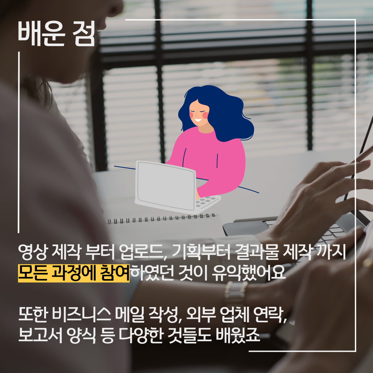 저희 부서가 영상제작 부터 업로드까지 모든 과정을 맡아서 하는 부서이다 보니깐 기획단계부터 피드백 단계까지 모든 과정을 배우는데 매우 유익하였습니다. 이 과정 속에서 상세한 저작권 문제, 기획 과정, 영상 제작 등을 어깨 넘어 배울 수 있었습니다.