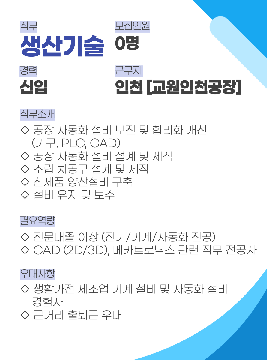 | [모집안내] Wells 생산관리팀 경력직 수시채용 (생산기술) (0) | 2021.03.02 |