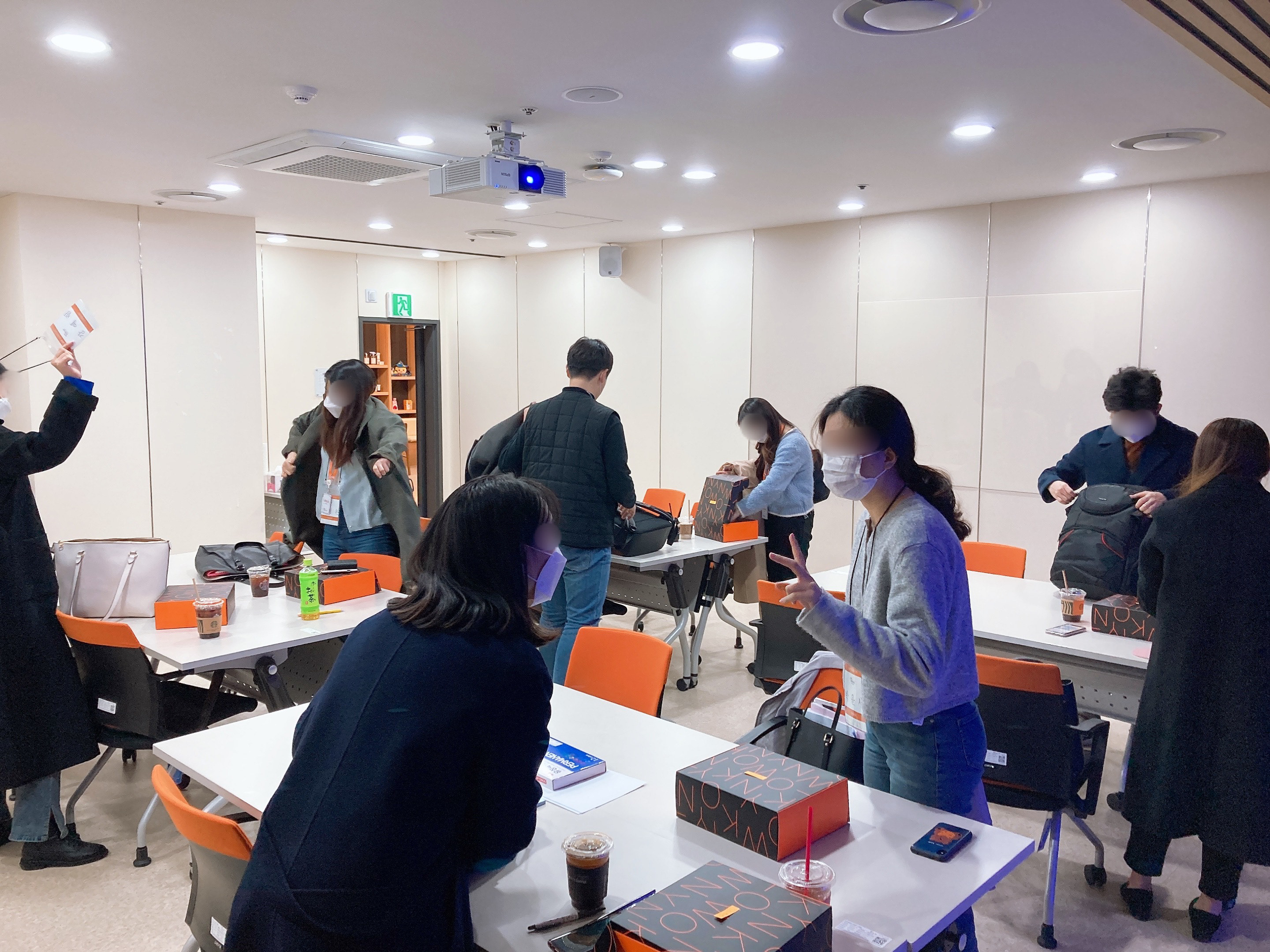 "책상 위 박스는 도대체 무엇인가!" 궁금한 기자단은 전투적인 언박싱을 시작합니다. 드리머 웰컴키트 속에는 출입증, 다이어리, 발대식 동안 사용될 명찰, 기자단 명함을 포함한 필수품과 작은 선물들이 들어있었습니다. 기자단 분들의 마음에 들기를 바랐는데, 인재채용팀의 마음이 전해졌길 바랍니다 :)