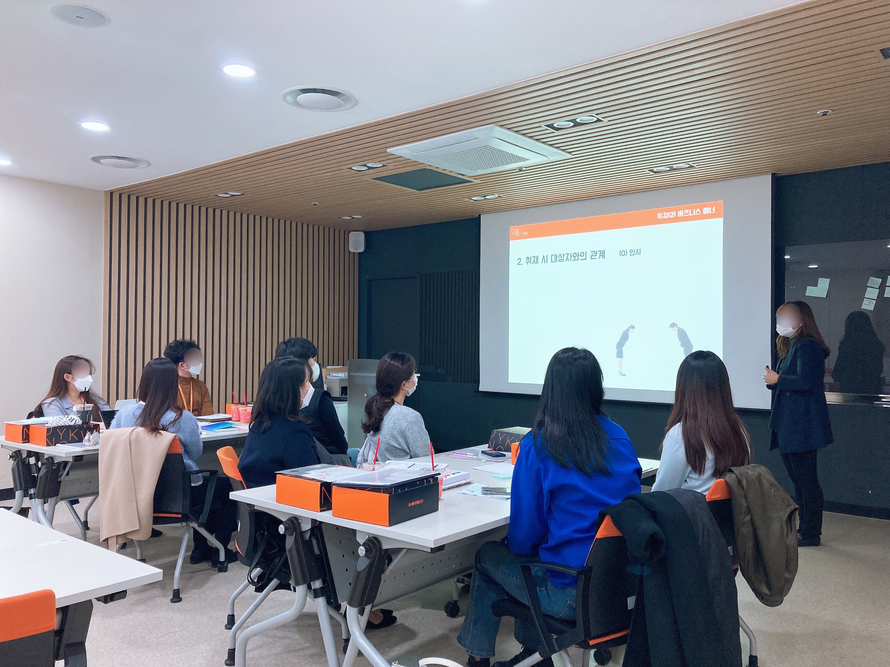 기자단 활동을 하며 콘텐츠를 기획하고, 영상물을 제작하는 것만으로는 부족합니다! 교원 드리머 기자님들께서 다소 생소할 수도 있는 비즈니스 매너 강의시간입니다. 취재 과정 중 다양한 교원인과 마주하며 비즈니스 문화에 빠르게 적응하고 녹아들 수 있도록 인재채용팀 이현주 파트장님께서 재미있는 "비즈니스 매너 강의" 마련해주셨습니다.