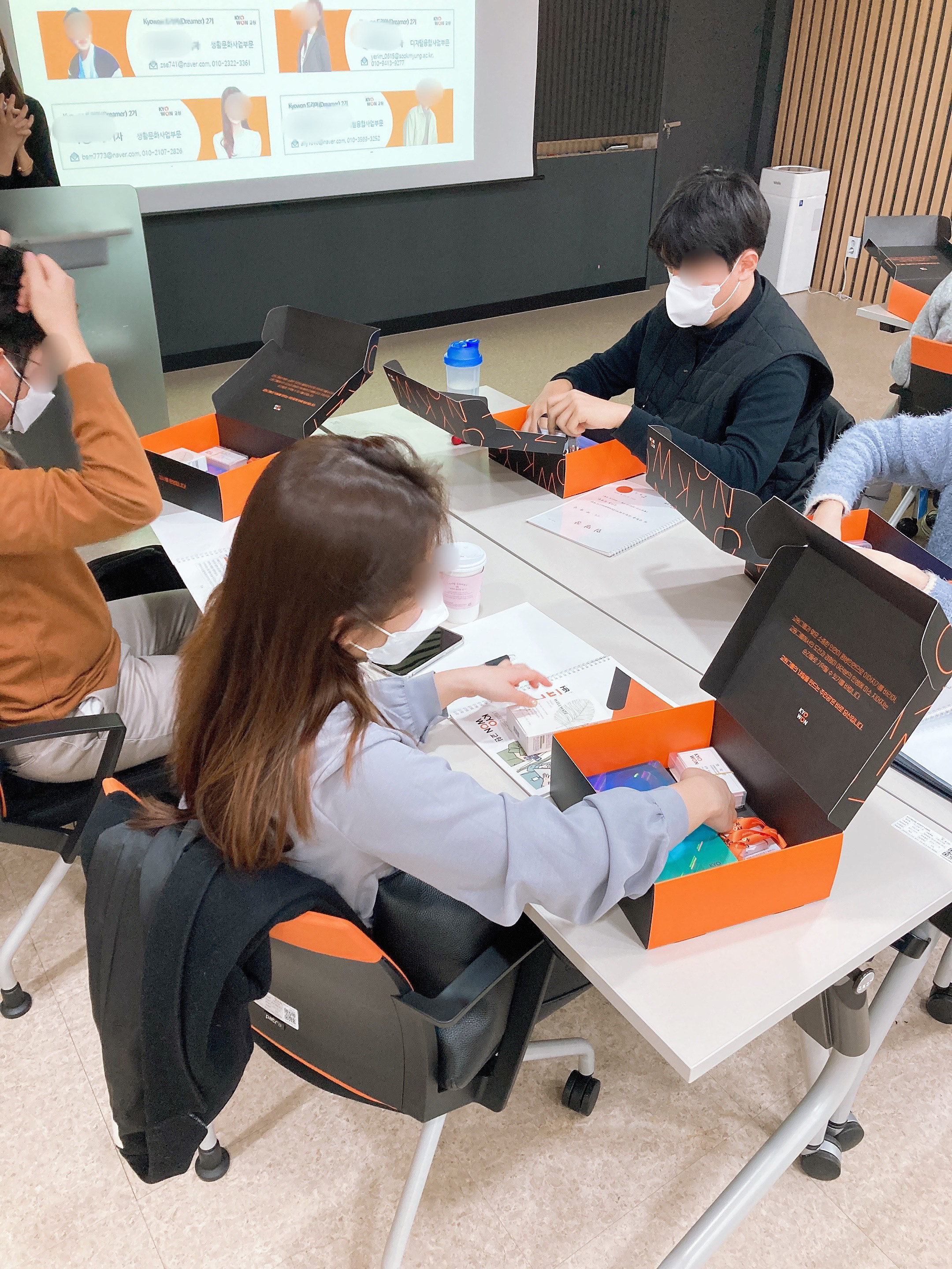 "책상 위 박스는 도대체 무엇인가!" 궁금한 기자단은 전투적인 언박싱을 시작합니다. 드리머 웰컴키트 속에는 출입증, 다이어리, 발대식 동안 사용될 명찰, 기자단 명함을 포함한 필수품과 작은 선물들이 들어있었습니다. 기자단 분들의 마음에 들기를 바랐는데, 인재채용팀의 마음이 전해졌길 바랍니다 :)