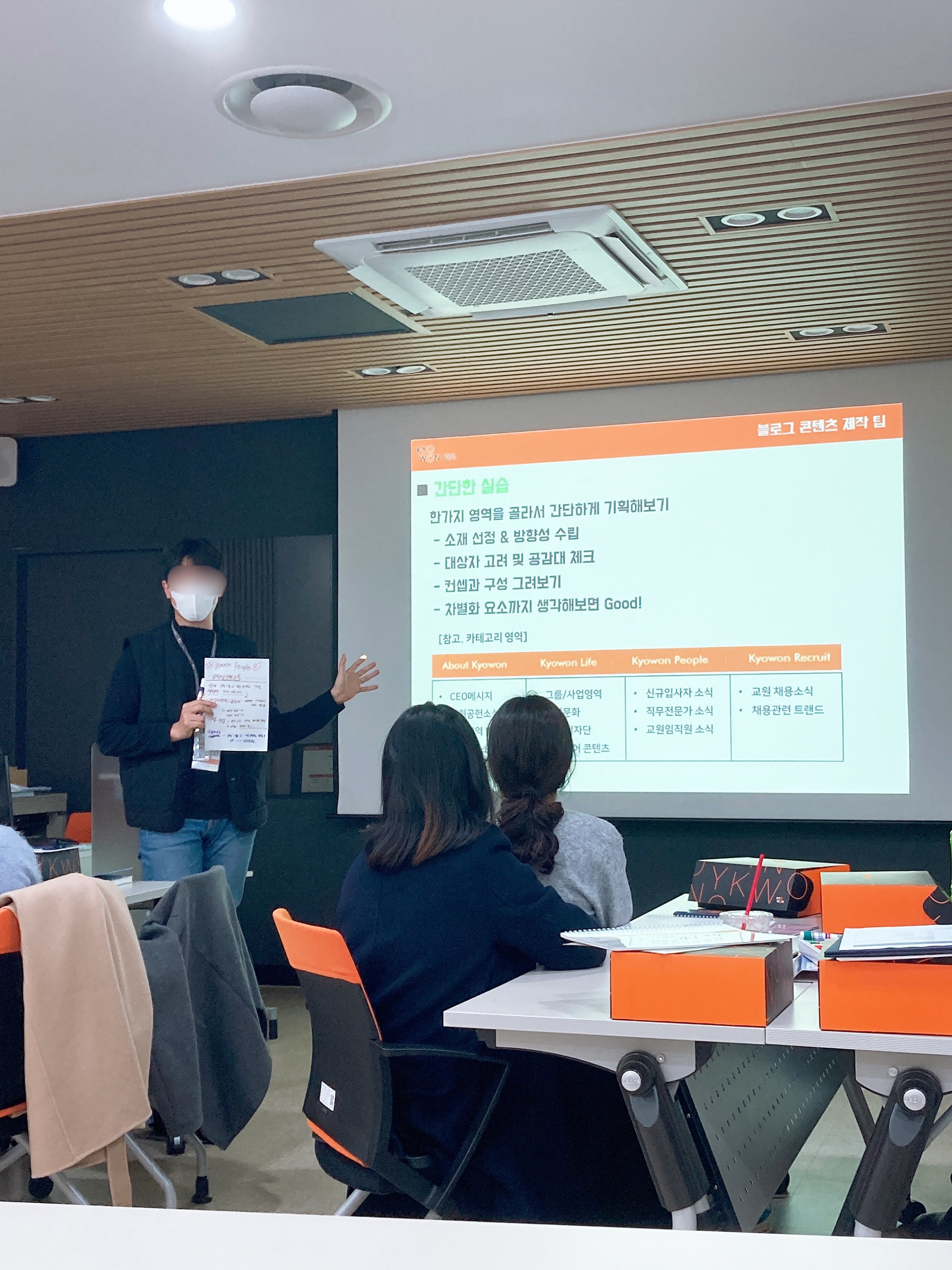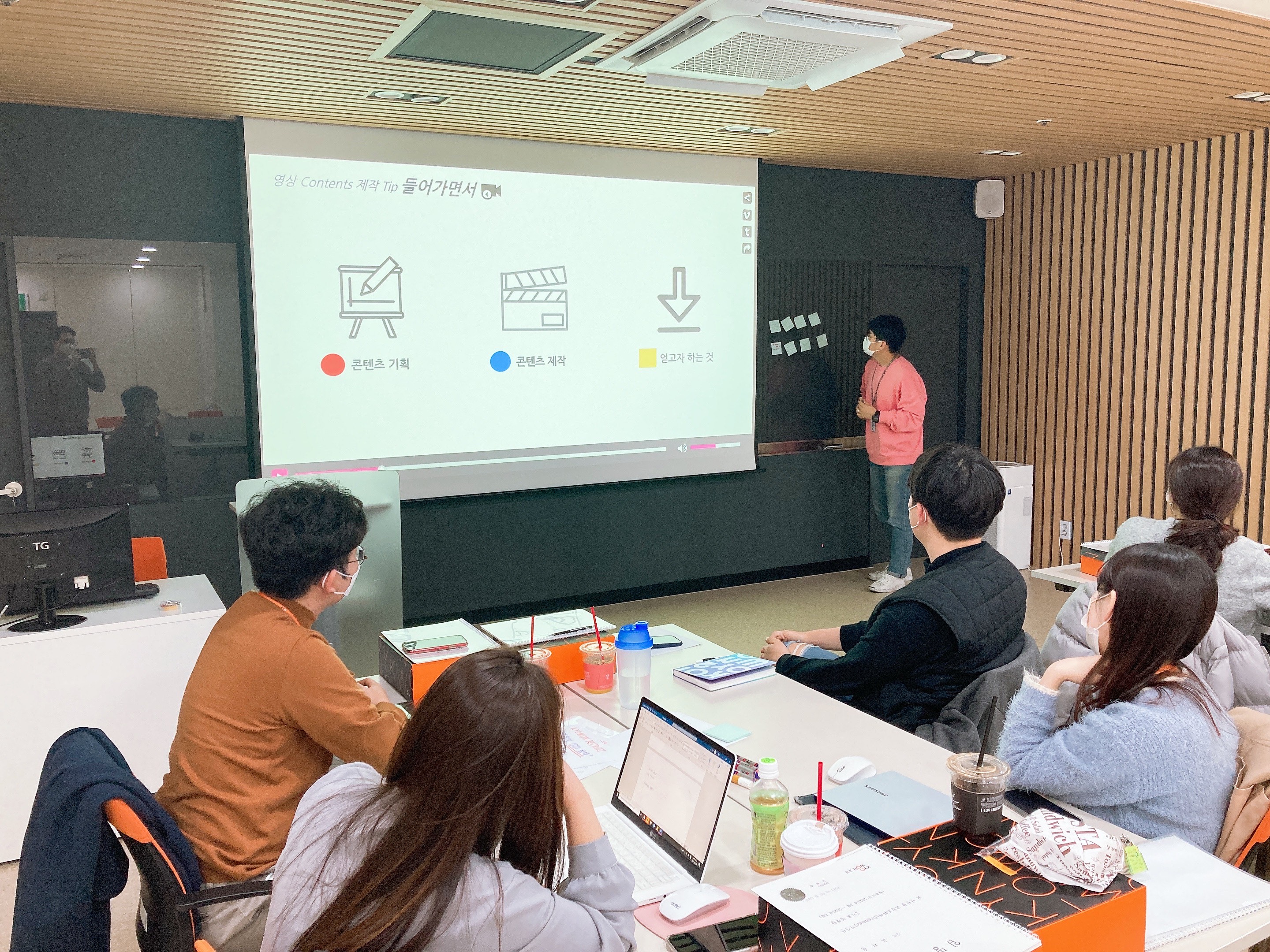 오전의 일정을 마친 뒤 간단한 점심식사를 즐기고 오후에는 인재개발팀 이휘건 매니저님의 "콘텐츠 기획과 제작"에 대한 꿀팁을 전수받는 시간을 가졌습니다. 점심식사시간과 휴식시간만으로는 서로 어색했던 기자단 친구들은 이휘건 매니저님의 입담과 간단한 기획, 아이디어를 공유하는 시간을 통해 정말 빠르게 친해진 것 같아요.