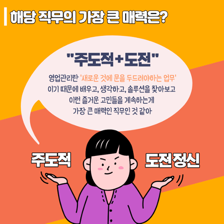 저는 새로운 것에 계속해서 문을 두드리며 업무를 진행하는 점이 영업관리의 큰 매력이라고 생각합니다.