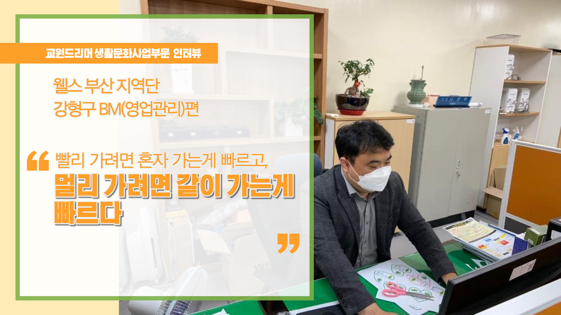 오늘 제가 찾아간 곳은 부산 동래에 위치한 웰스 부산 지역단입니다. 그럼 웰스 부산 지역단으로 가는 길부터 시작해서 어떤 환경에서 일하고 있는지, 또한 어떤 교원인들이 근무하고 있는지 웰스 부산 지역단 강형구 BM(Branch manager - 지점장)님과 함께 인터뷰를 진행하며 알아보도록 하겠습니다.