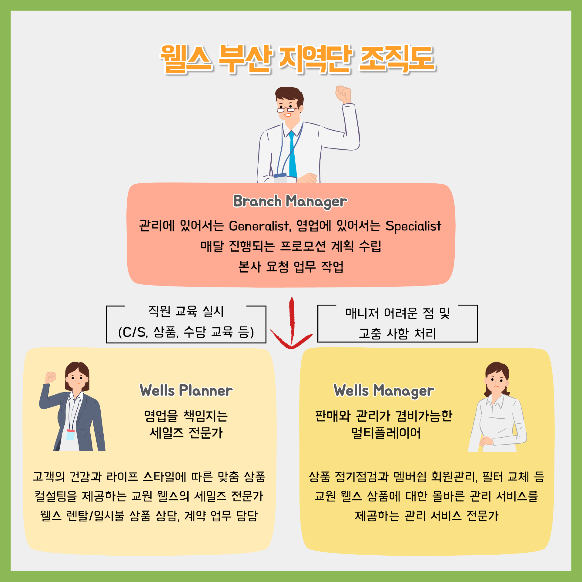 부산지역단에는 영업만 담당하는 웰스 플래너, 정기적으로 관리서비스와 영업을 함께하는 웰스 매니저가 있습니다.