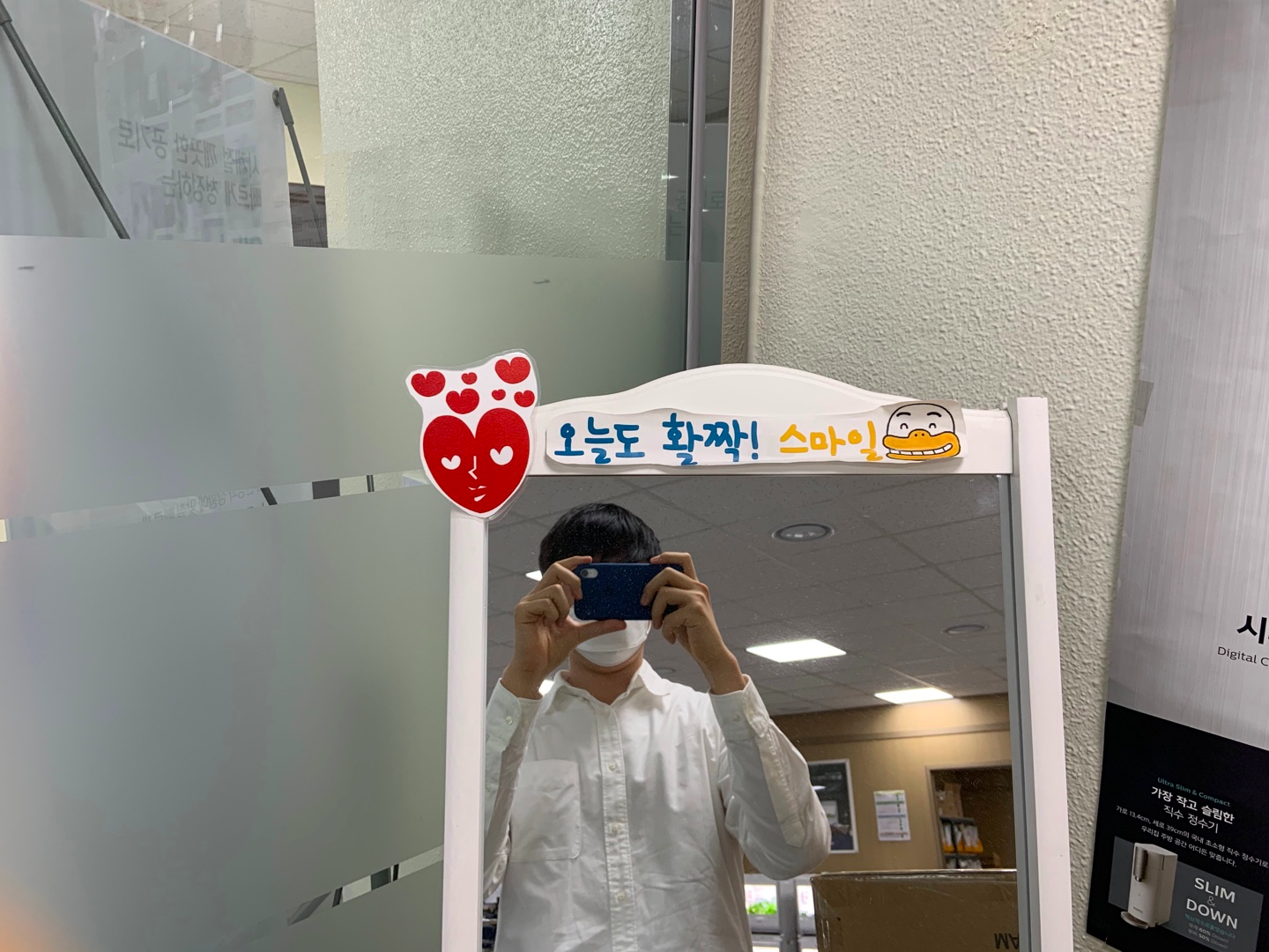 사무실에 들어가자마자 저를 반겨주는 전신 거울! 거울 위에 써져있는 문구를 통해 하루를 기분 좋게
