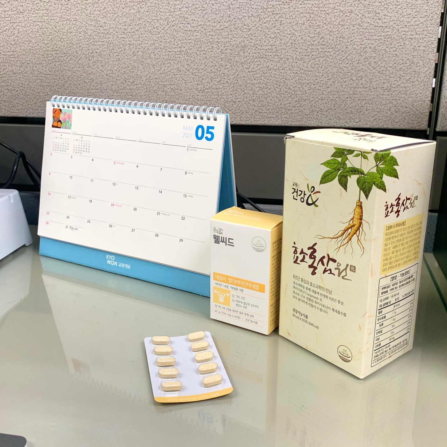 양치 후에는 [더오름 데일리 멀티비타민]과 [효소홍삼원]을 챙겨 먹으며 오후 업무를 위한 활력을 찾습니다.