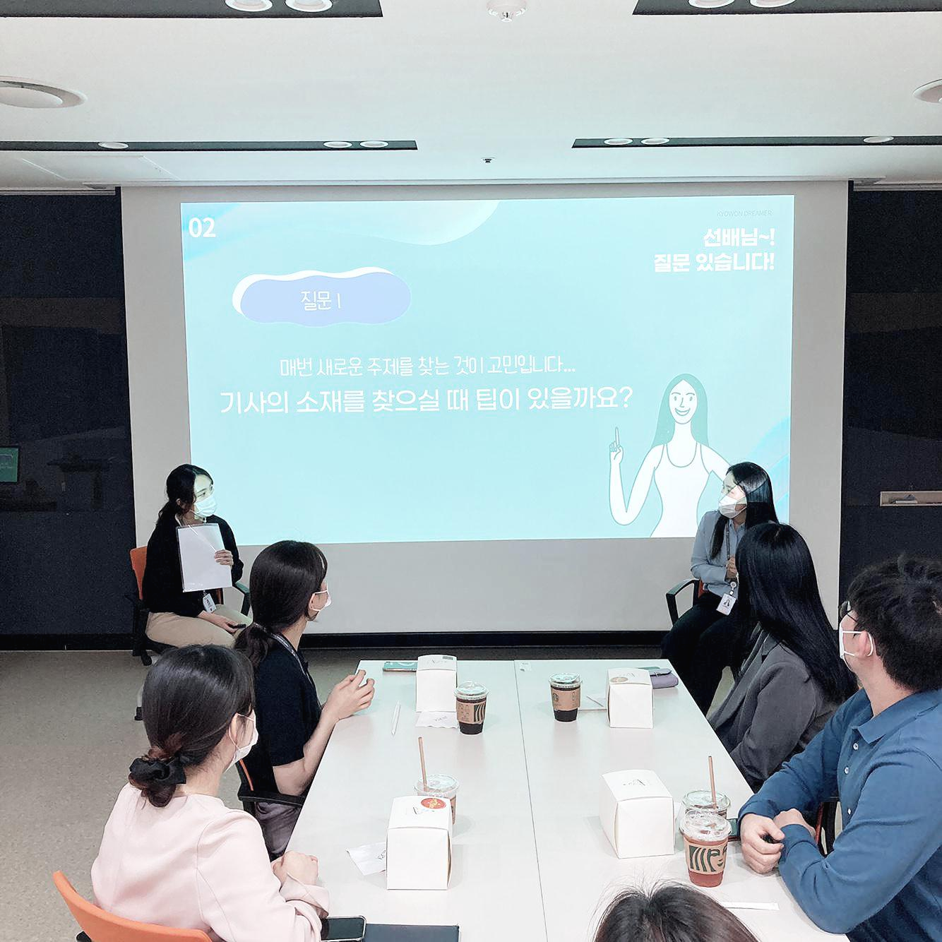 기사의 소재를 찾는 방법, 취재 대상자의 반응을 유도하는 방법, 그리고 콘텐츠 구상과 제작에 생기는 다양한 상황에 대처하는 방법까지 정말 초대 드리머의 꿀팁을 모두 전수해주셨습니다. 하지만 뭐니 뭐니 해도 대학생의 신분으로 입사에 성공하신 김민정 연구원님을 바라보자니 취업 준비과정과 꿀팁이 궁금한 드리머였습니다! 취업뽀개기 스토리까지 꼼꼼히 듣게된 드리머, 그 궁금증이 해결되셨길 바랍니다~!