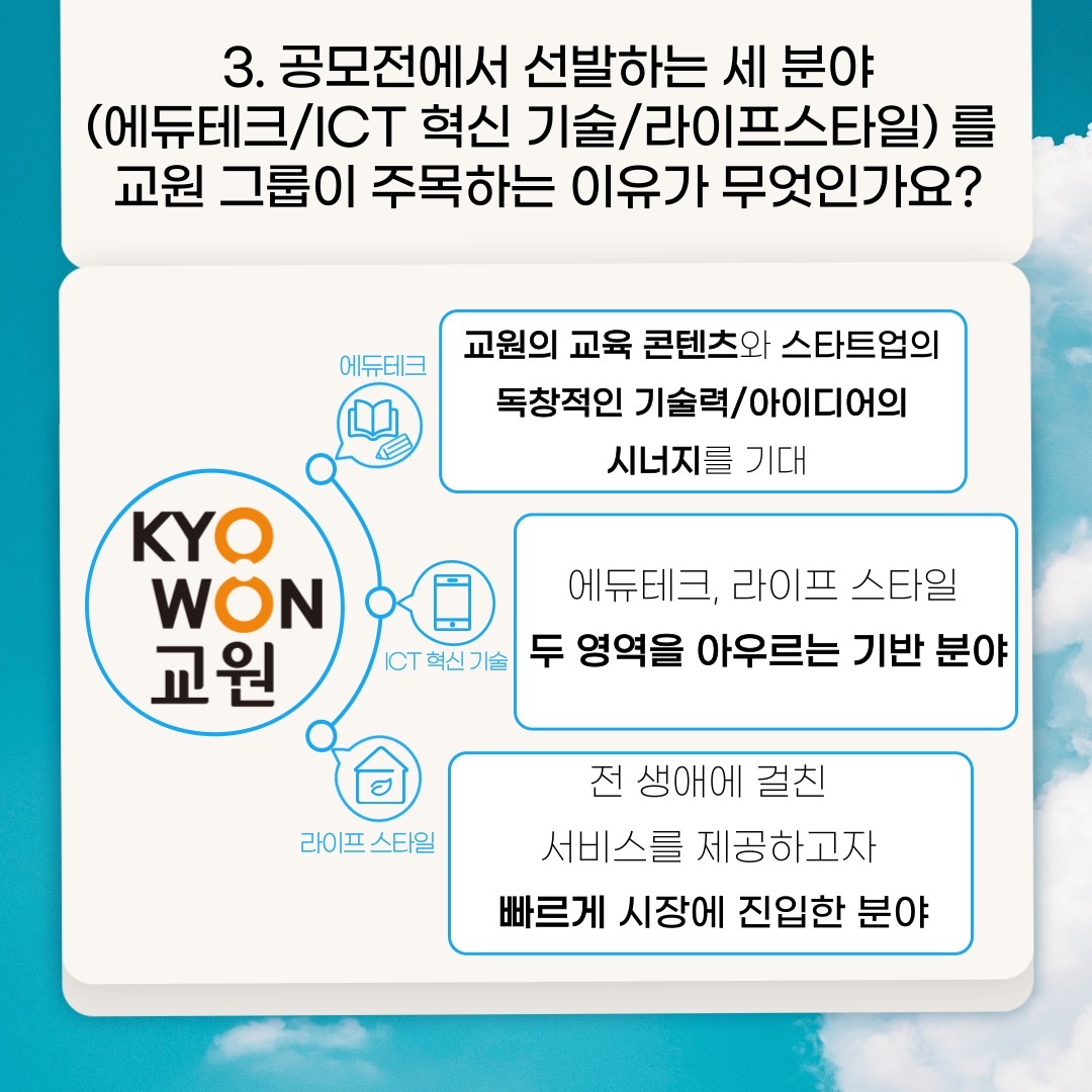 A3) 교원은 대한민국No.1 교육기업으로 에듀테크 분야에서 교원의 교육 콘텐츠 및 영업, 유통 등의 인프라와 스타트업의 독창적인 기술력/아이디어가 접목 된다면 더욱 큰 시너지를 일으킬 수 있다고 생각합니다.