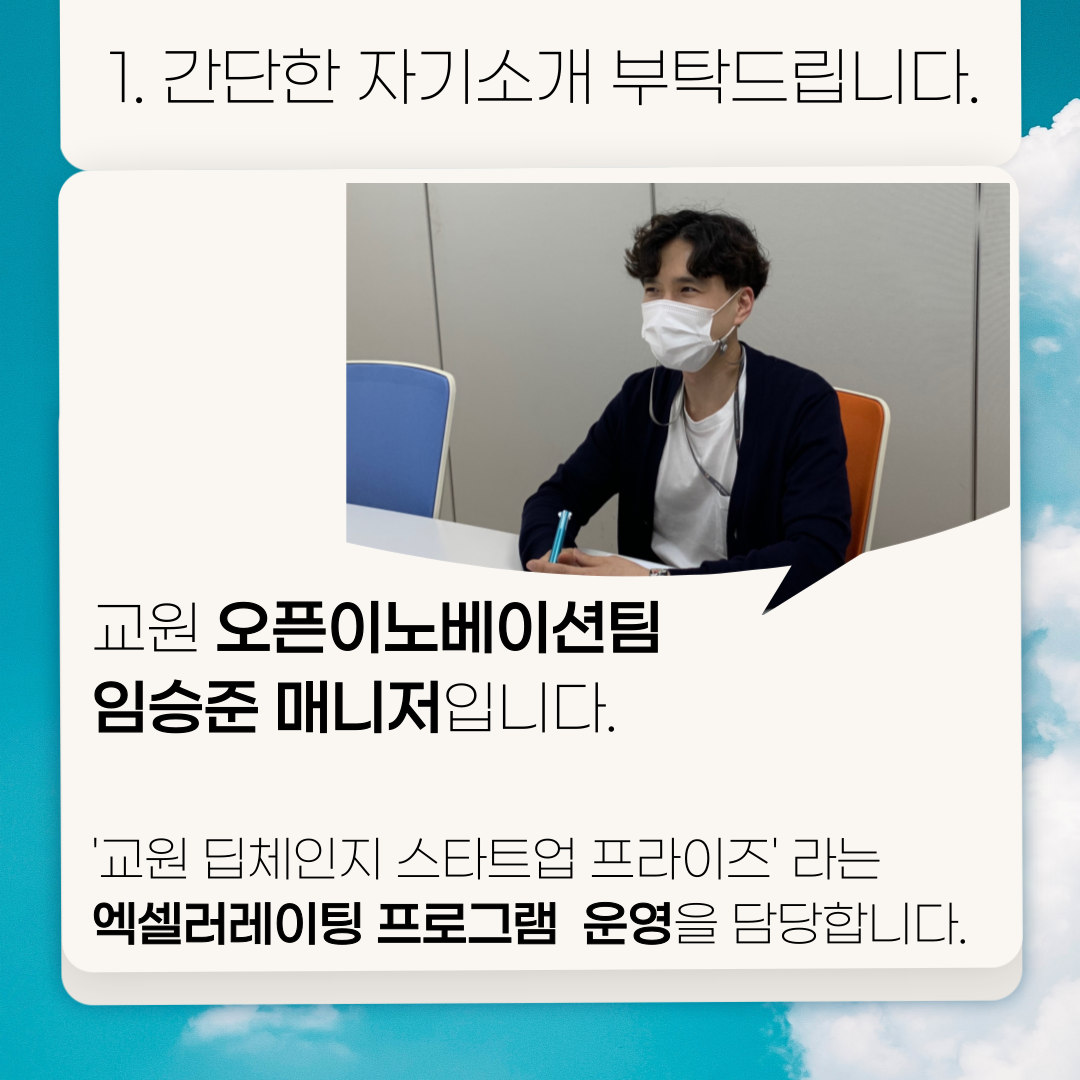 저는 ‘교원 딥체인지 스타트업 프라이즈’ 라는 액셀러레이팅 프로그램 운영을 담당하고 있습니다.