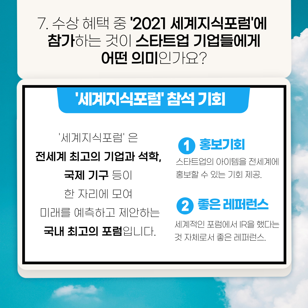 Q7) 해당 공모전의 수상 혜택 중에 투자금과 상금 외에 ’2021 세계지식포럼‘에 참석할 수 있는 기회가 주어진다고 들었는데요.