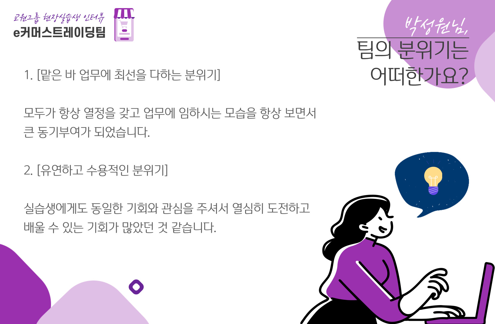 실습생에게도 많은 관심과 기회를 주고 챙겨주세요. 프로모션 아이디어를 제출하거나 상품을 제안할 때면 늘 아낌없이 칭찬과 피드백을 주시며 그에 맞는 이유도 구체적으로 설명해주셔 정말 많이 도전하고 배울 수 있었습니다.