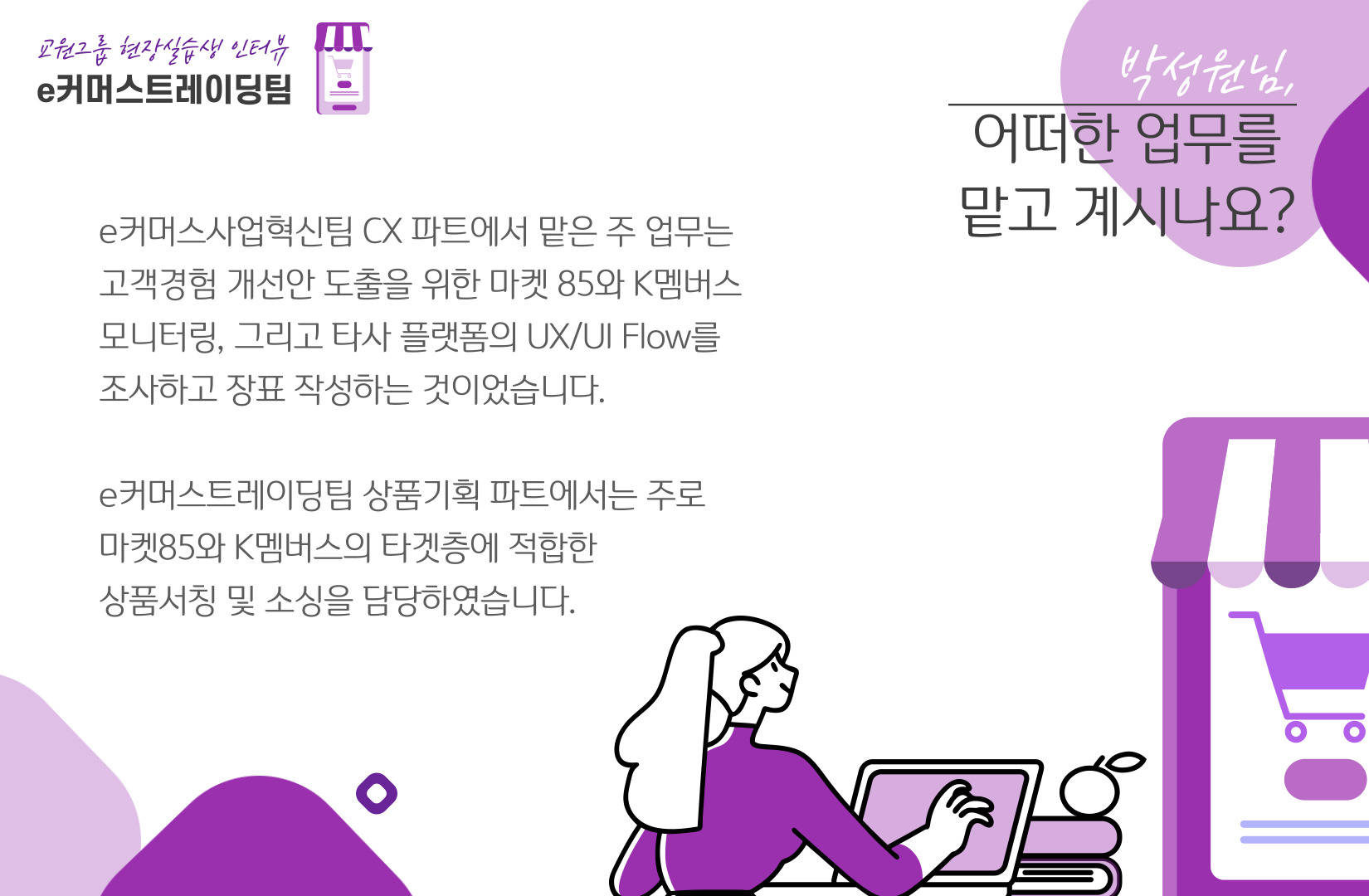 e커머스사업혁신팀의 CX 파트에서 8주간, e커머스트레이딩팀에서 상품기획 파트에서 16주간의 실습을 마치게 되었습니다. 두 팀에서 근무를 하며 앞서 HR 블로그에 업로드된 e커머스 팀의 강현지, 김연선 실습생들과 모두 인연이 있습니다.