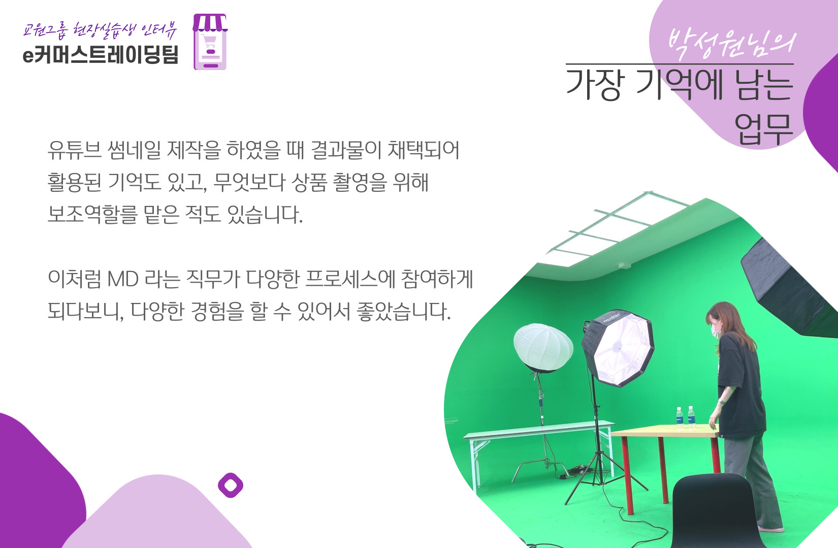 유튜브 썸네일 제작을 하였을때 결과물이 채택되어 활용된 기억도 있고, 상품 촬영을 위해 촬영 보조 역할을 맡은 적도 있습니다. MD 직무라는 것이 기획부터 마무리까지 많은 부분에 관여를 하다 보니 다양한 경험과 추억을 쌓을 수 있어 팀원분들께 감사한 마음이 있어요.