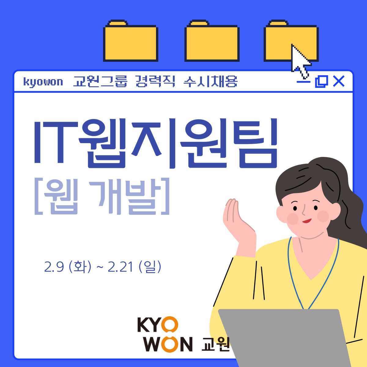 [모집안내] IT웹지원팀 경력직 수시채용 (웹 개발) 교원그룹의 쉽고 빠른 채용 소식을 접하시고 싶다면? 교원그룹 인재채용 인스타그램을 팔로우하고 소식을 받아보자! 인스타그램 @kyowon_recruit Find your job/수시채용 2021.02.10