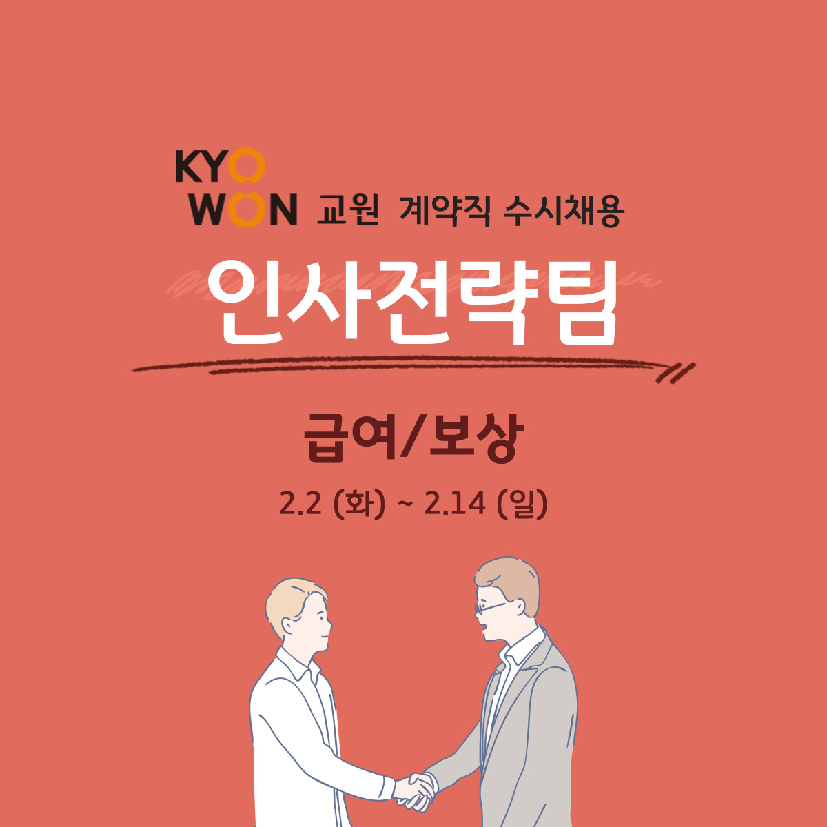 [모집안내] 인사전략팀 계약직 채용 (급여 및 보상) 교원그룹의 쉽고 빠른 채용 소식을 접하시고 싶다면? 교원그룹 인재채용 인스타그램을 팔로우하고 소식을 받아보자! 인스타그램 @kyowon_recruit Find your job/수시채용 2021.02.02