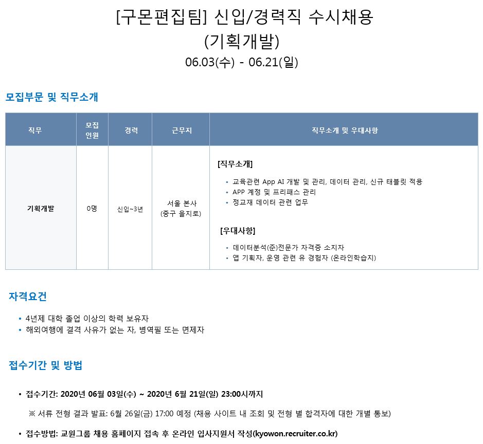 교원그룹에서 를 진행합니다! 예년과 달리 이번 공채는 교원그룹의 미래 10년을 이끌어가기 위한 역량을 갖춘 후보자님이 계시다면, 정해진 TO 외에도 추가로 인재를 선발할 계획입니다. 교원그룹의 미래 10년을 함께 이끌어주실 멋진 후보자님들의 많-은 관심 부탁드립니다. 공식 모집포스터 및 영상은 11/2(월) 교원그룹 채용사이트 및 HR블로그에 오픈될 예정입니다. 그 전에! COVID-19로 채용설명회를 통해 여러분을 뵙지 못하는 아쉬움을 가득가득 담아 모집과 관련한 여러분의 궁금증을 미리 확인하고, 공식 영상으로 답변을 드리는 작은 소통 이벤트를 진행하려 합니다. 지원자 분들의 많은 관심 부탁드립니다~ ^^ [클릭하시면, 자세한 내용을 확인하실 수 있습니다]