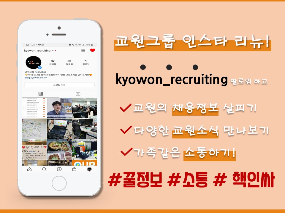 안녕하세요 :D 여러분들은 어떤 회사에 근무하고 싶나요? 좋은 근무환경, 칼퇴, 워라밸 등. 이 모든 것이 보장된 회사를 원할 텐데요! 여러분들이 원하는 회사 속에 저희 교원도 속하는지 궁금하여 한 번 저희 직원들에게 물어보았습니다~ 직원들이 생각하는 교원그룹의 키워드는? 저희 직원들은 교원그룹 하면 떠오르는 키워드로 워라밸과 역세권을 꼽았습니다! 이러한 키워드는 저희 교원그룹 사옥을 확인해보시면 바로 알 수 있는데요. 그래서 현재 우리 현장실습생을 통해 교원그룹 사옥 곳곳의 복지환경을 소개해 보겠습니다~! 교원그룹, 어디까지 알고 있니? 위치 : 서울 중구 을지로 51 홈페이지 : http://www.kyowon.co.kr 교원그룹 내외빌딩은 서울 중구에 위치해 있습니다. 그래서 을지로입구역 4번 출구..